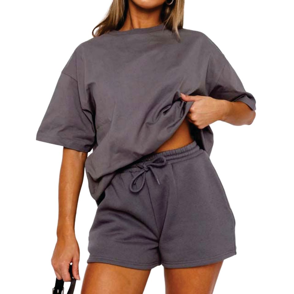 ชุดเซ็ตเสื้อยืดกับกางเกงขาสั้นสำหรับผู้หญิง ผ้าถักผสมคอตตอนและสแปนเด็กซ์ ระบายอากาศได้ดี เอวสูง มีเชือกผูก เหมาะสำหรับออกกำลังกาย