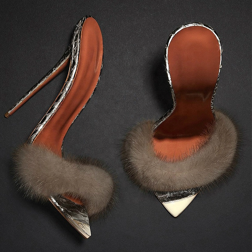 รองเท้าส้นสูงแบบสวมเปิดนิ้วเท้าประดับขนเฟอร์นุ่มๆ สีทองล้วน สำหรับผู้หญิง ไซส์ใหญ่ 45