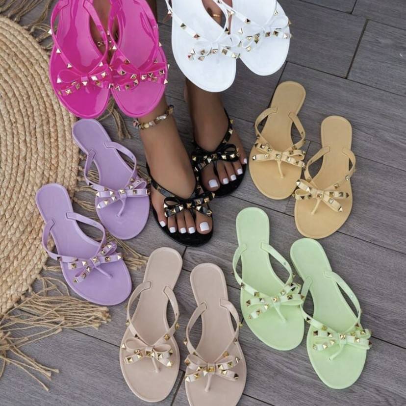 รองเท้าแตะแฟชั่นฤดูร้อนสำหรับผู้หญิงรองเท้าฟลิปฟลอปส้นแบนประดับหมุดสำหรับชายหาดรองเท้าแตะผู้หญิงรองเท้าเจลลี่สำหรับเด็กผู้หญิง