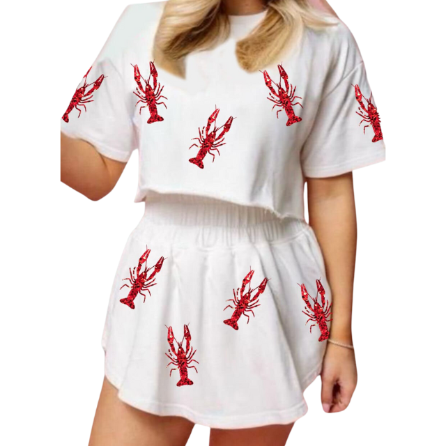 ชุดกระโปรงผ้าฝ้ายเนื้อนุ่มสำหรับผู้หญิง2ชิ้นชุดเสื้อกีฬาแขนสั้นลายครอว์ฟิชสำหรับฤดูร้อน
