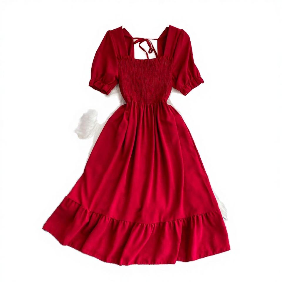 เดรสทรงเอไลน์ผ้าทอเนื้อนุ่มระบายอากาศดี คอปกสี่เหลี่ยม แขนสั้น สไตล์ลำลอง เอวทรงเอ็มไพร์ แต่งระบาย ใส่สบายในช่วงฤดูร้อน เป็นมิตรต่อสิ่งแวดล้อม