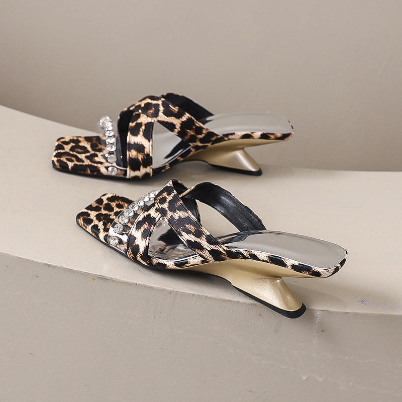 รองเท้าส้นสูงแฟชั่นสายไขว้สำหรับผู้หญิงพิมพ์ลายเสือดาวประดับพลอยเทียมรูปทรงพิเศษสง่างามสำหรับฤดูร้อน