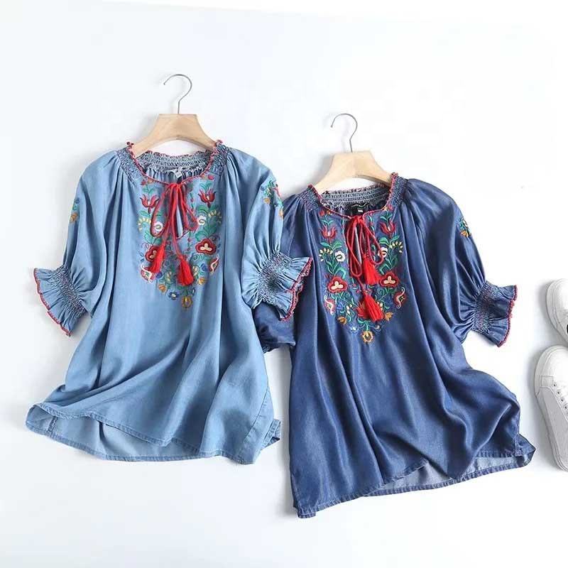 Summer Style Vintage O-neck String Denim T-shirt Embroidered Puff Sleeve Womens Jeans T-shirt