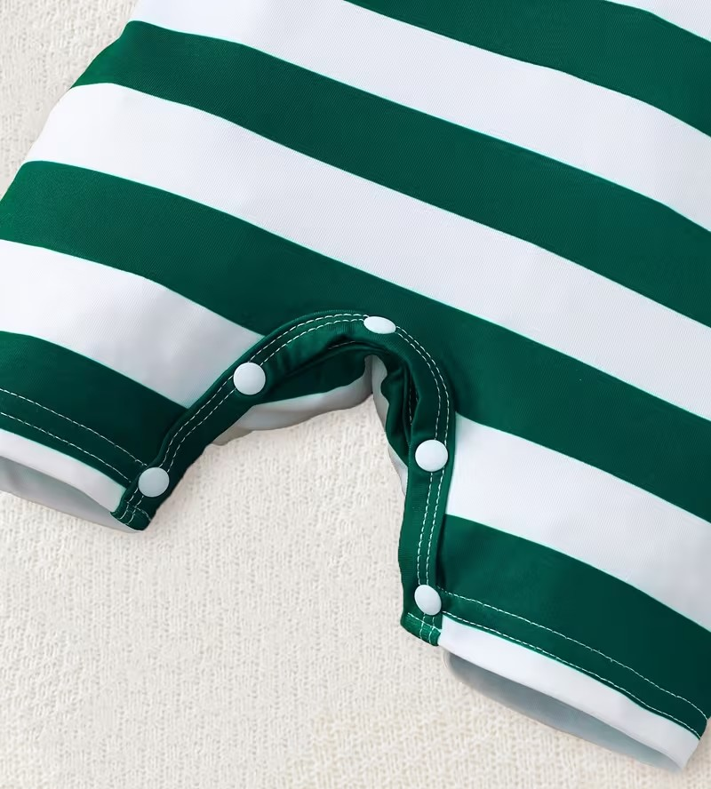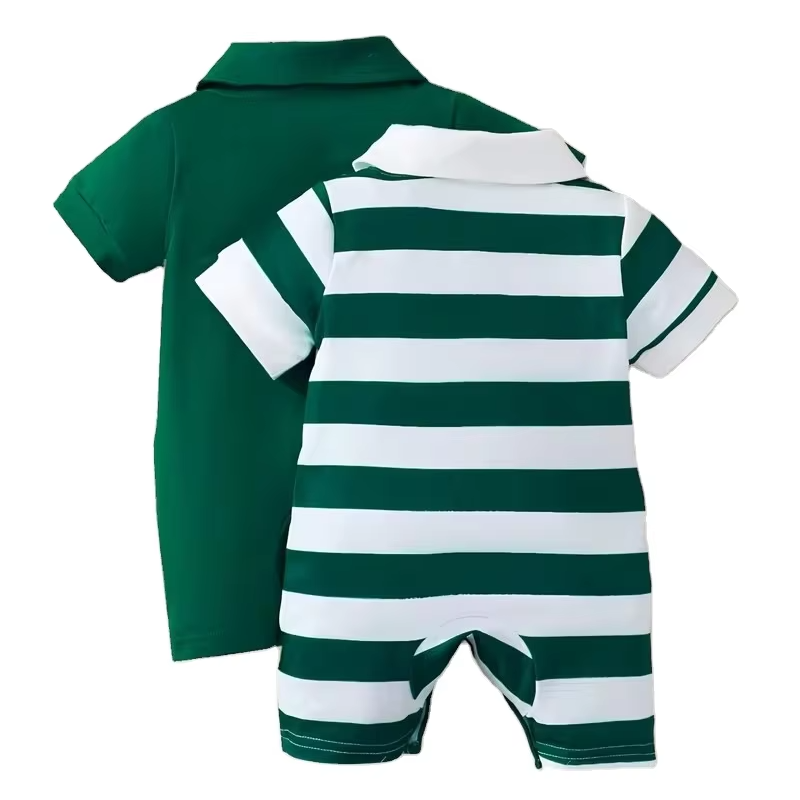 ชุดรอมเปอร์แขนสั้นผ้าปะต่อสีเขียว ระบายอากาศได้ดี เป็นมิตรกับสิ่งแวดล้อม ดีไซน์ทันสมัยสำหรับฤดูร้อน พร้อมกระดุมที่คอเสื้อ สำหรับเด็กผู้ชาย