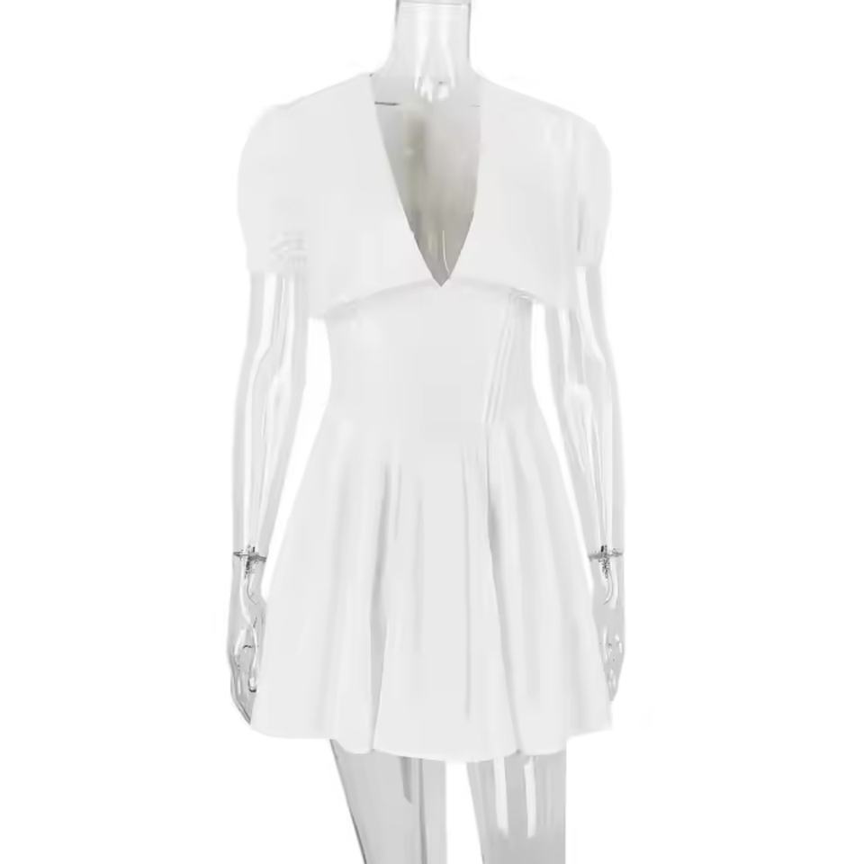 เดรสทรงวีคอวีเข้ารูปเซ็กซี่แขนสั้นขายดี ผ้าสีพื้นเรียบง่าย สไตล์ลำลองสำหรับผู้หญิง