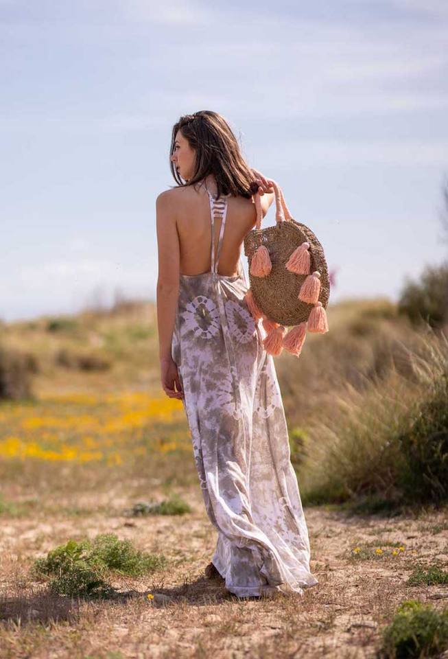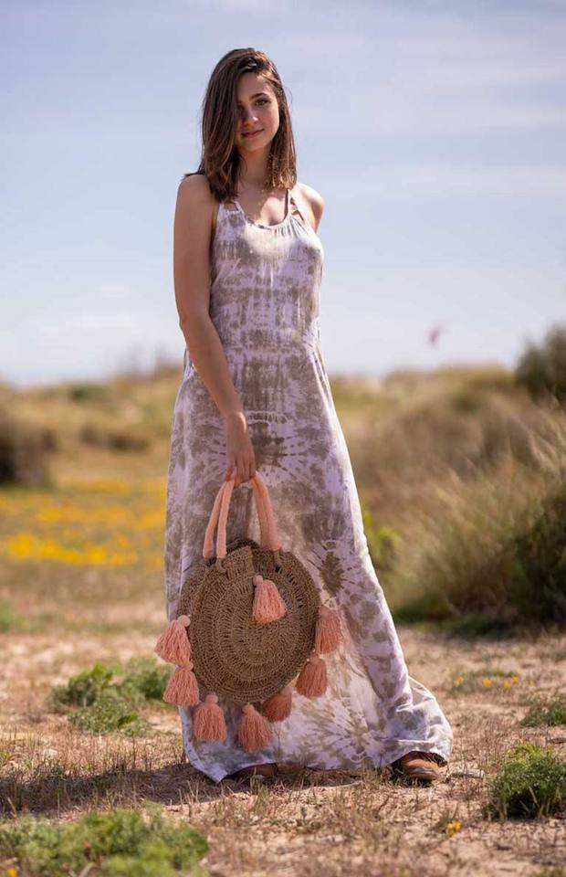 ชุดแมกซี่มัดย้อมยาวคอกลมแขนกุดสไตล์โบฮีเมียนทรงหลวมชุดชายหาดสำหรับผู้หญิงชุดเดรสสำหรับวันหยุดฤดูร้อน
