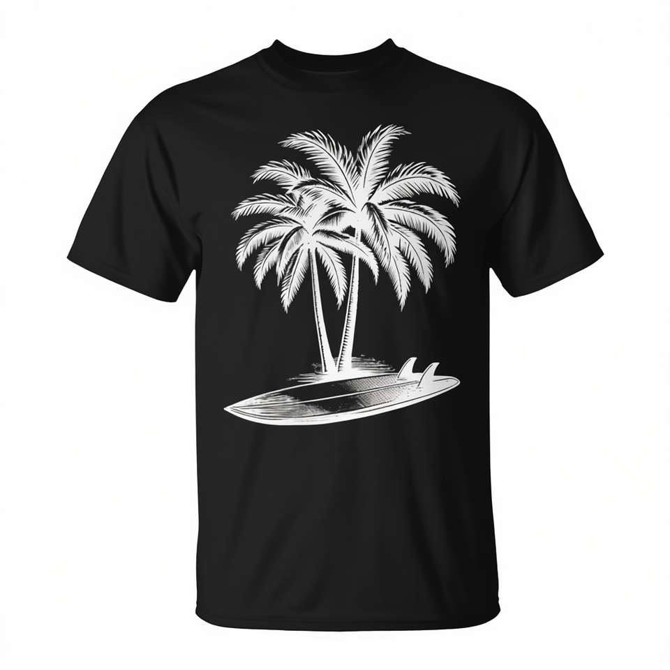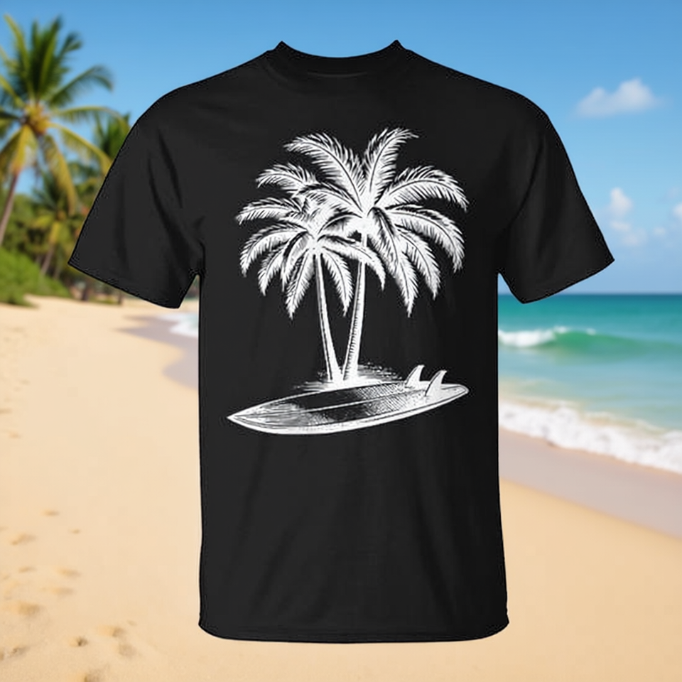 เสื้อยืดลายต้นปาล์มและกระดานโต้คลื่นสำหรับวันหยุดฤดูร้อน พิมพ์ลายซิลค์สกรีน แขนสั้น ใส่ได้ทั้งชายและหญิง สไตล์วินเทจ เหมาะสำหรับใส่ไปชายหาด