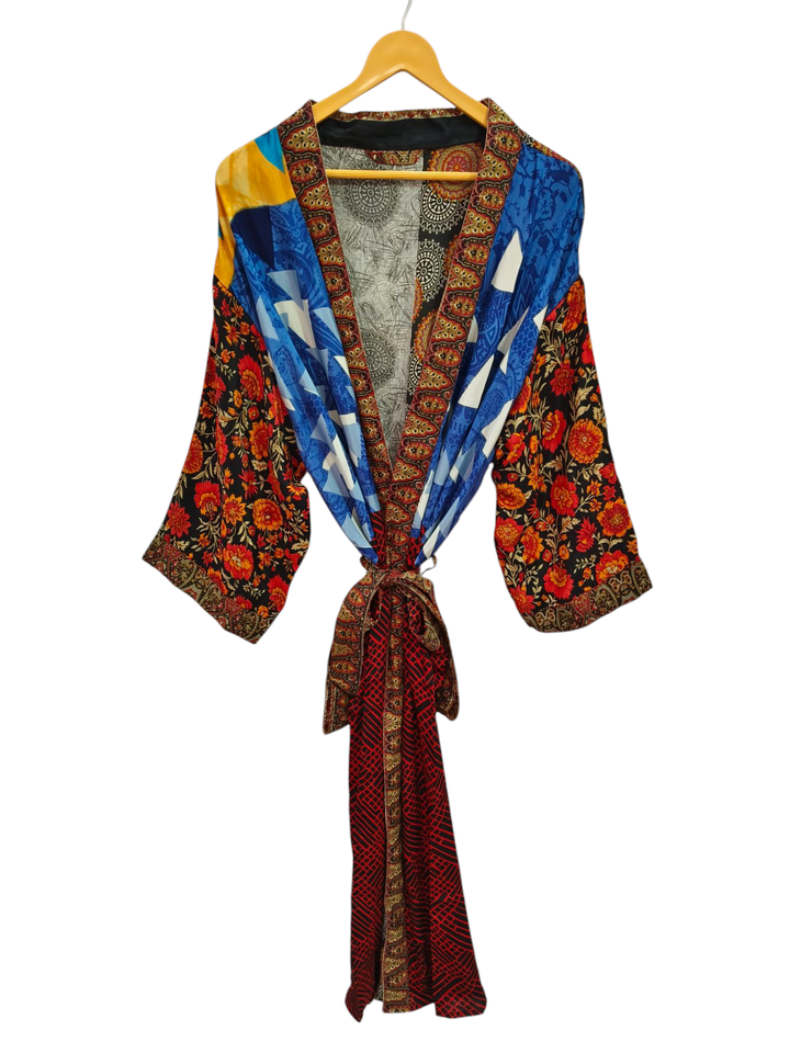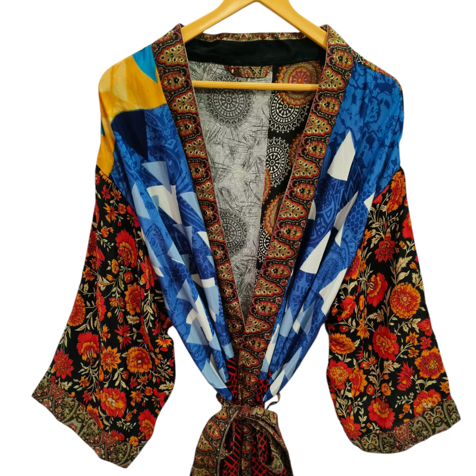 เสื้อคลุมอาบน้ำผู้หญิงหลากสีใส่กลางคืนเสื้อคลุมยาวพิมพ์ลายดอกไม้อินเดียวินเทจผ้าไหมส่าหรีสไตล์กิโมโน
