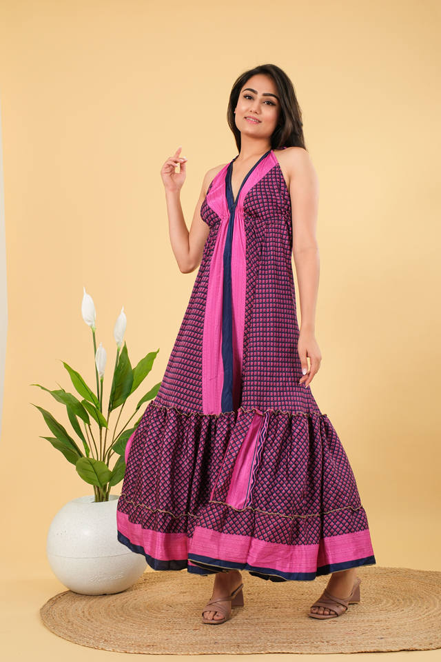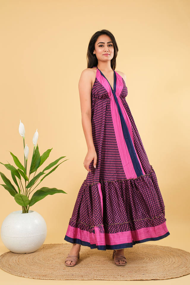 ชุดแม็กซี่วินเทจฤดูร้อนสำหรับผู้หญิงสไตล์อินเดียผ้าไหมธรรมชาติชั้นดอกไม้ผูกคอแขนกุดหน้าจอสวยงามยาวถึงพื้น