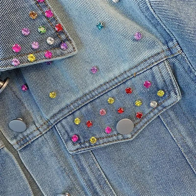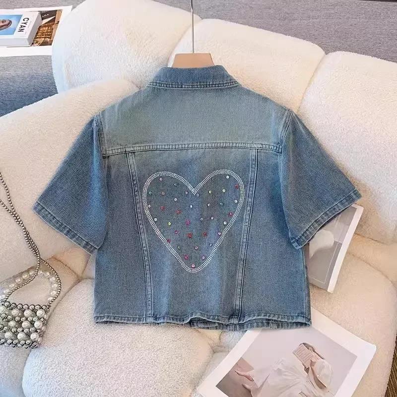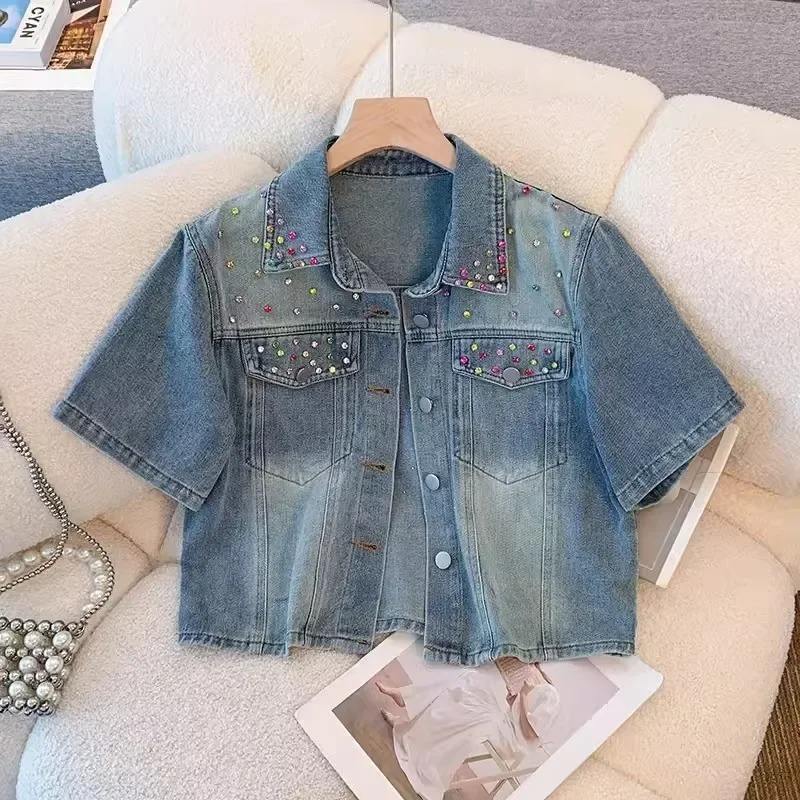 แจ็กเก็ตยีนส์ตัวสั้นสีน้ำเงินสำหรับผู้หญิงใส่ในฤดูร้อนเสื้อแจ็คเก็ตยีนส์แขนสั้นมีเพชรปกเสื้อโค้ทนักเรียนทั่วไป