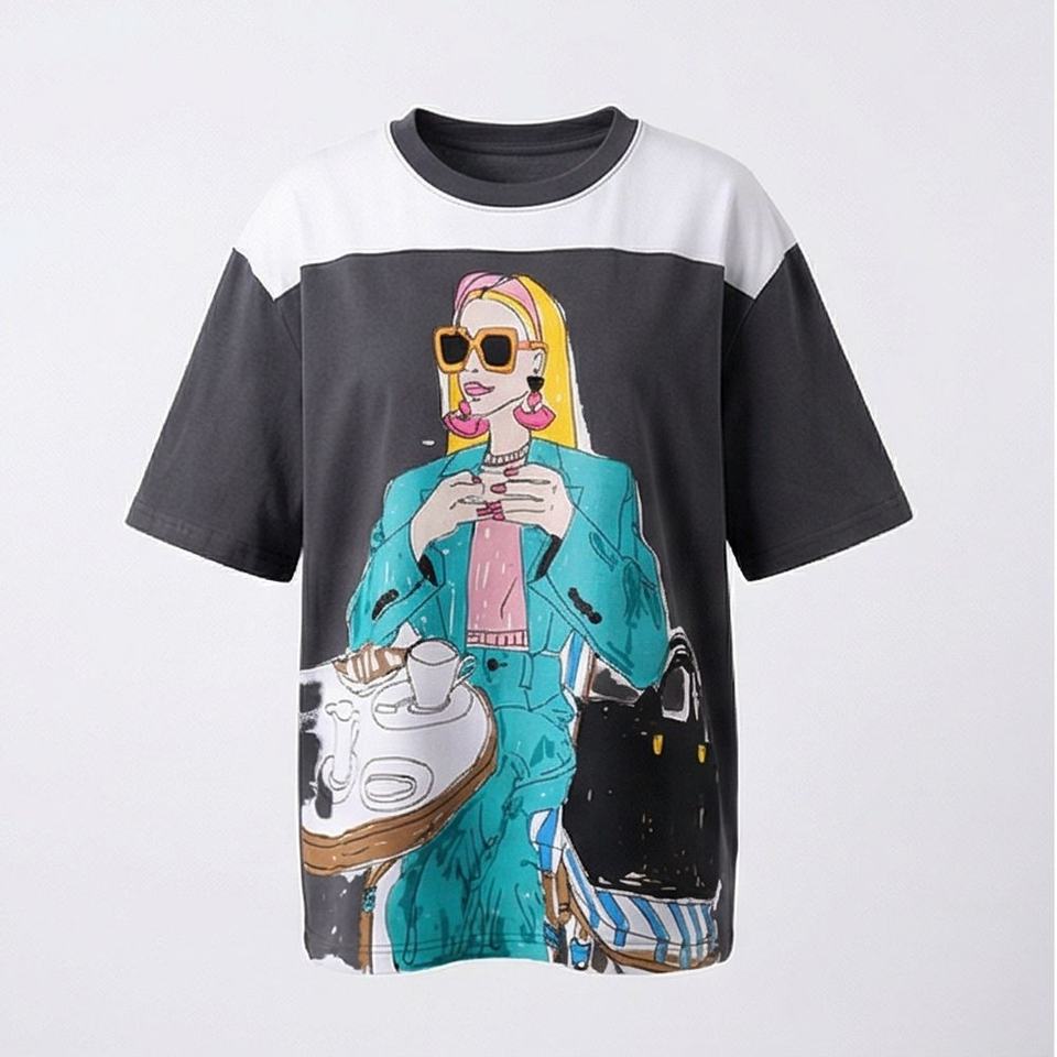 เสื้อยืดลำลองผู้หญิงสำหรับฤดูร้อน คอกลม แขนสั้น ทรงหลวม ระบายอากาศได้ดี พิมพ์ลายสาวน้อย ดีไซน์ทันสมัย เนื้อผ้านุ่ม สวมใส่สบาย