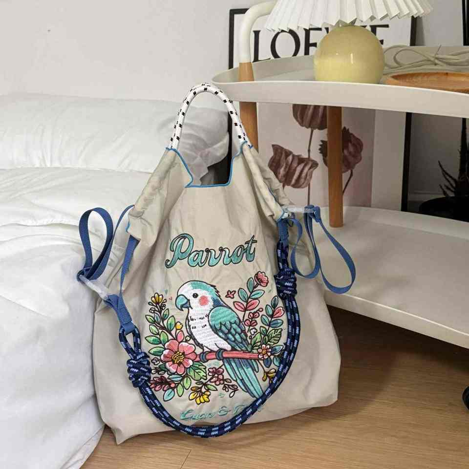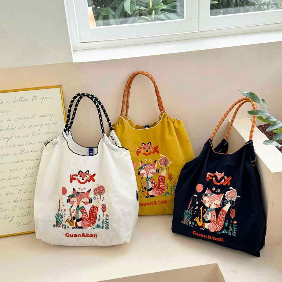 กระเป๋าสะพายไหล่ผู้หญิงสำหรับฤดูร้อน แบบมีโครงด้านใน ผ้าไนลอน พิมพ์ลายการ์ตูน แฟชั่น ความจุเยอะ ปิดด้วยเชือก เหมาะสำหรับการช้อปปิ้ง