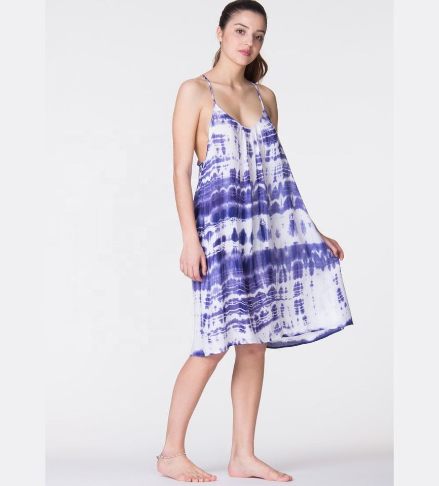 เดรสสั้นผ้าเรยอนพิมพ์ลายการ์ตูนสไตล์โบฮีเมียนสำหรับผู้หญิงช่วงฤดูร้อน ทำมือแบบย้อมสี