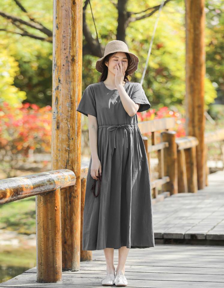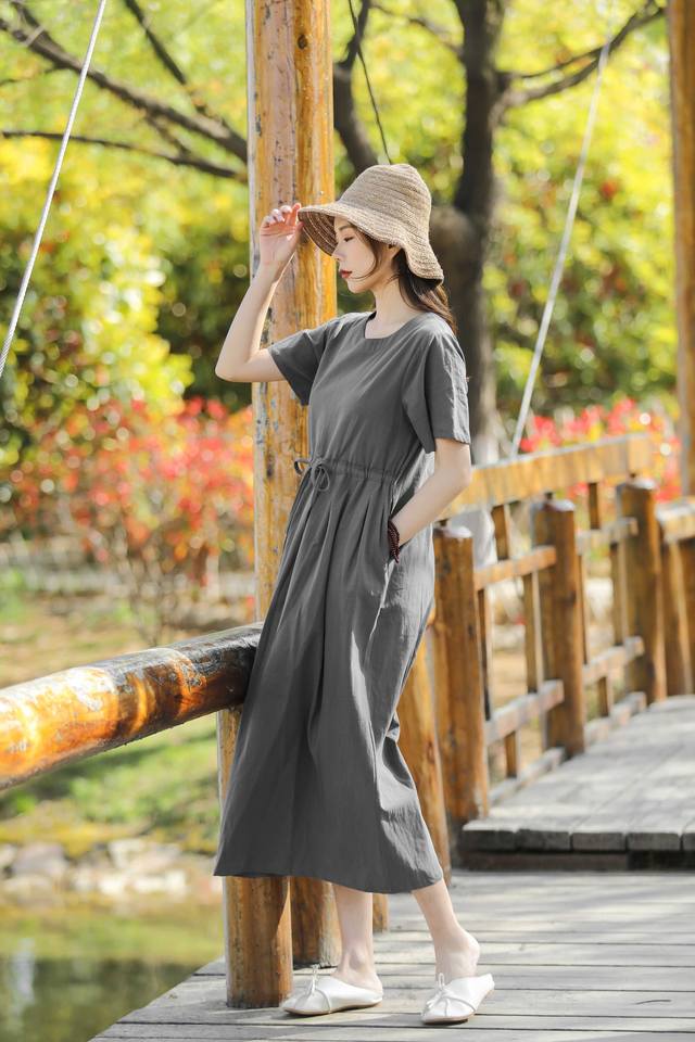 Summer Women's Cotton Linen Solid A-Line Regular Fit O Neck Short Sleeve Waist Belt Pockets Maxi Dress