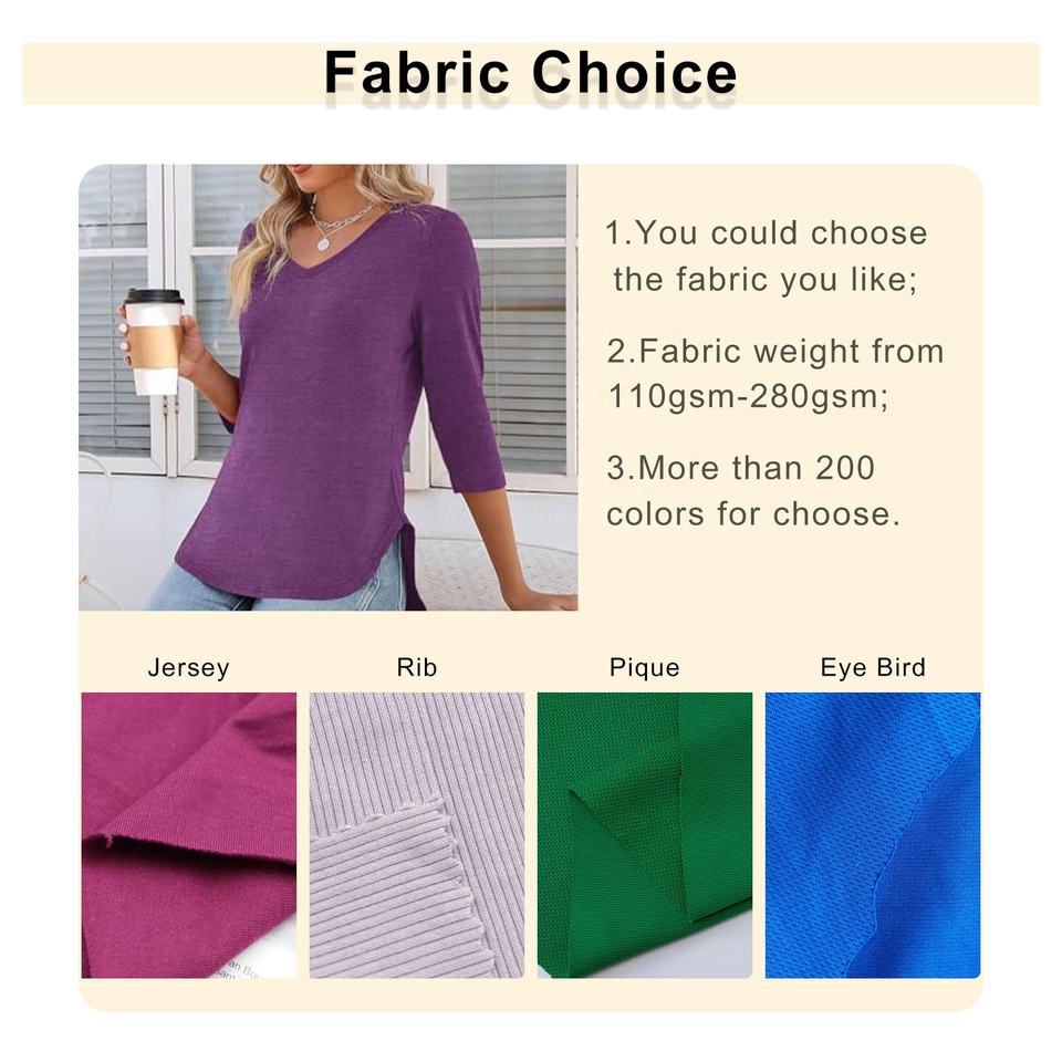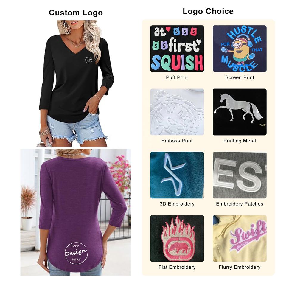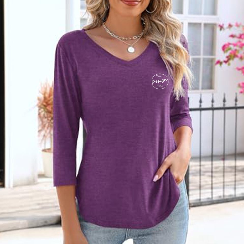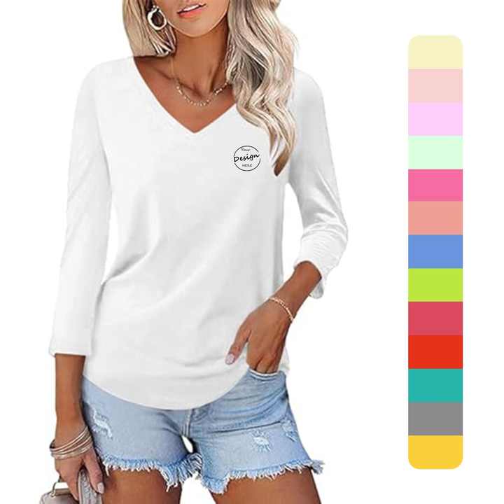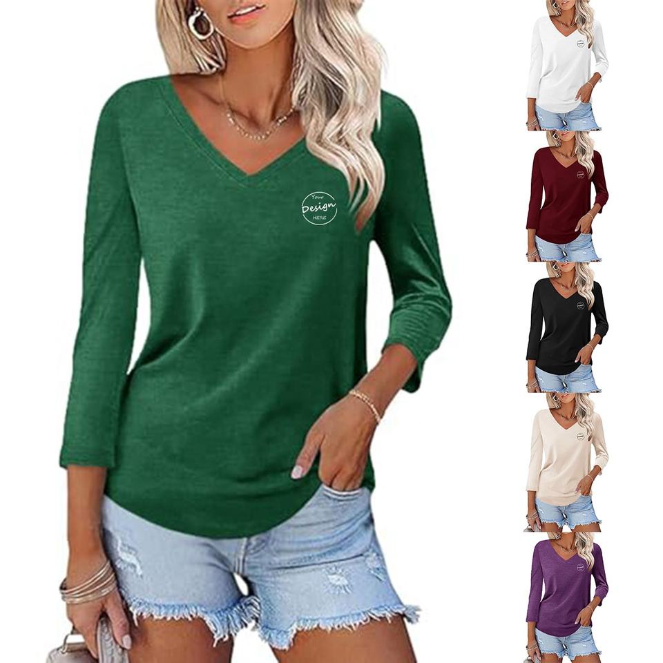 เสื้อคอวีลึกของผู้หญิงผ้าคอตตอน100% คุณภาพสูงปักตามสั่งฤดูร้อนพิมพ์ลายลำลองแขนสามส่วนคอตตอนสีพื้นน้ำหนักเบา