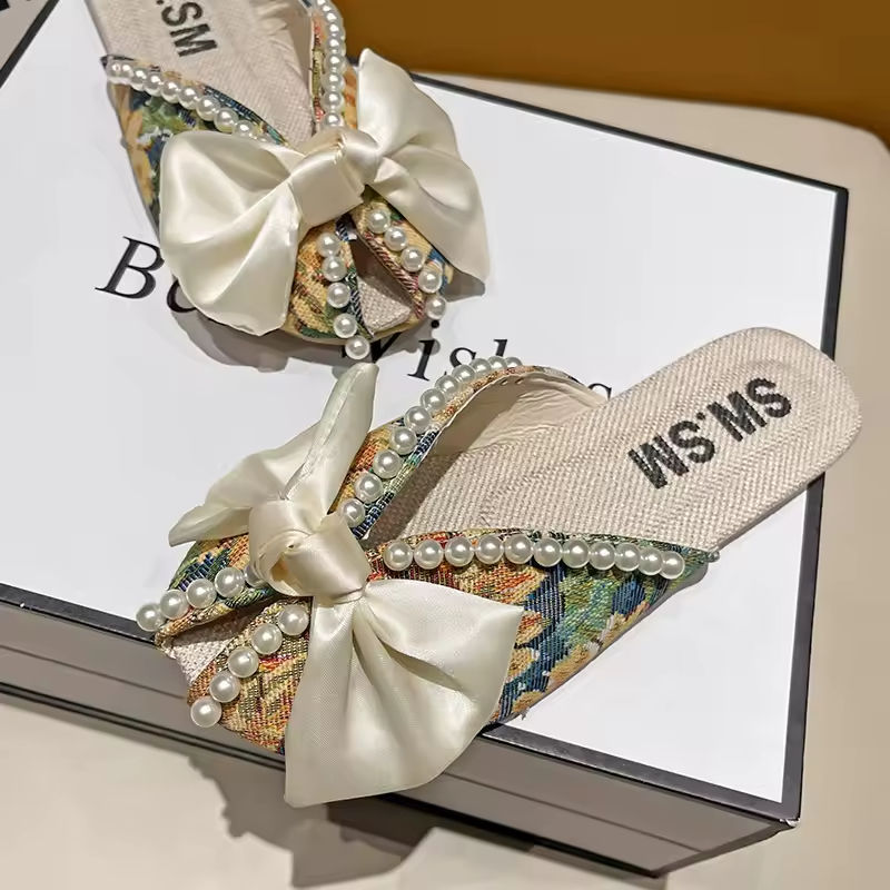 รองเท้าส้นสูงแบบส้นเข็มประดับลูกปัดปักลายหนังแท้กันลื่นสำหรับผู้หญิง ดีไซน์เนอร์ รุ่นซัมเมอร์ สายรัดข้อเท้า เซ็กซี่ ทรงหัวแหลม สีเขียวอมฟ้า