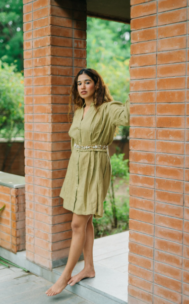 เดรสสั้นคอสูงของผู้หญิงสำหรับฤดูร้อนสีพื้นปักลายด้วยเข็มขัดกระดุมแบบลำลองย้อมสีธรรมดาซักได้สินค้าใหม่