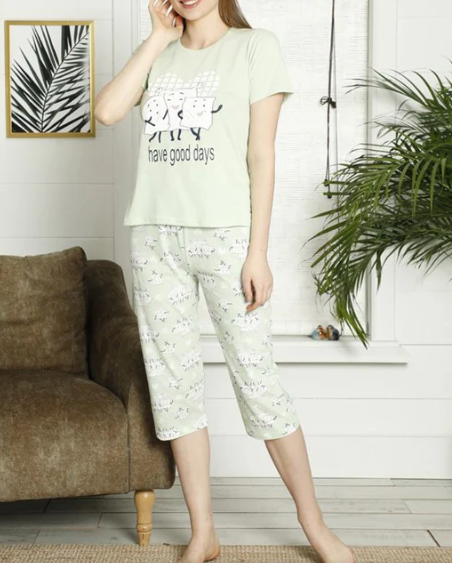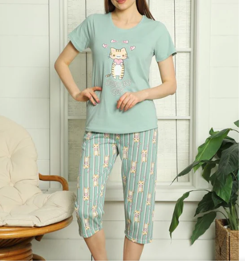 เซ็ตชุดนอนสตรีใส่อยู่บ้านแขนสั้นลำลองกางเกงยาวถึงน่องสำหรับฤดูร้อน