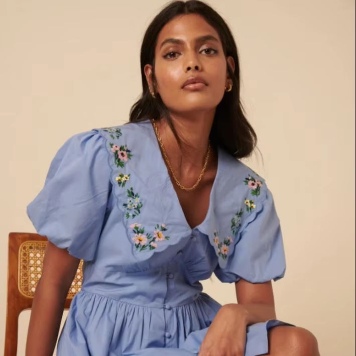 เสื้อเบลาส์ผ้าฝ้ายแขนสั้นสำหรับผู้หญิงใส่ฤดูร้อนพร้อมรายละเอียดเสื้อคอวีกลวงแขนพองมีคุณภาพระดับพรีเมียม