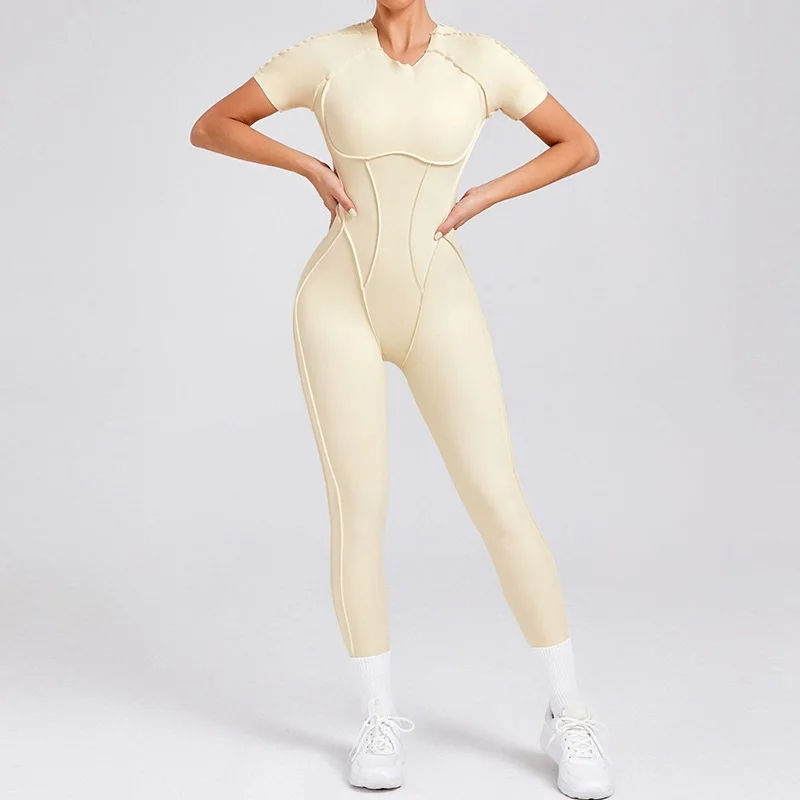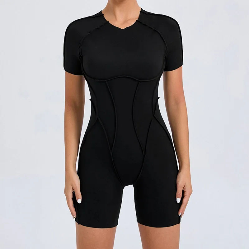 จั๊มสูทกีฬาขาสั้นสำหรับผู้หญิงฤดูร้อนสายคล้องไหล่ชุดโยคะชิ้นเดียวกระชับสะโพกสำหรับวิ่งกลางแจ้งยิมพิมพ์ลาย