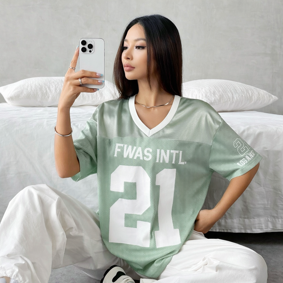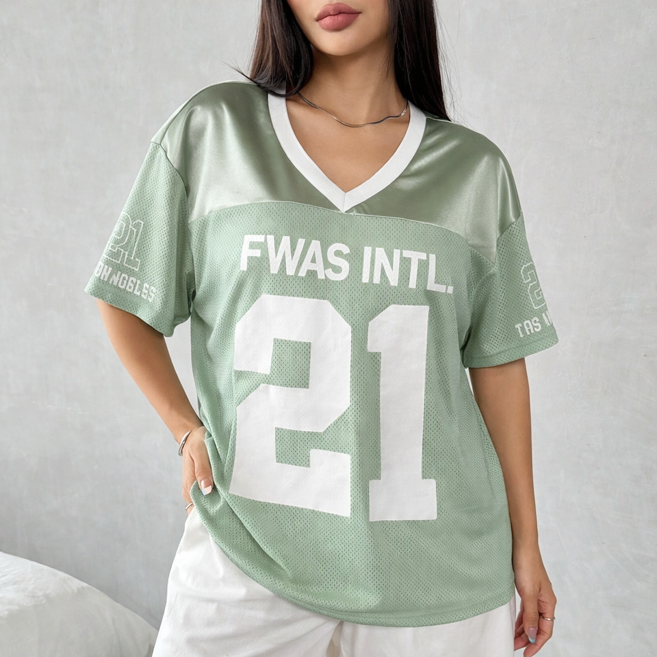 เสื้อยืดโอเวอร์ไซส์สไตล์สปอร์ตสำหรับผู้หญิงลายพิมพ์ตัวอักษรแบบกำหนดเอง เสื้อแฟชั่นสตรีทแวร์แบบเจาะรู เสื้อเจอร์ซีย์อเมริกันฟุตบอลสำหรับฤดูร้อน