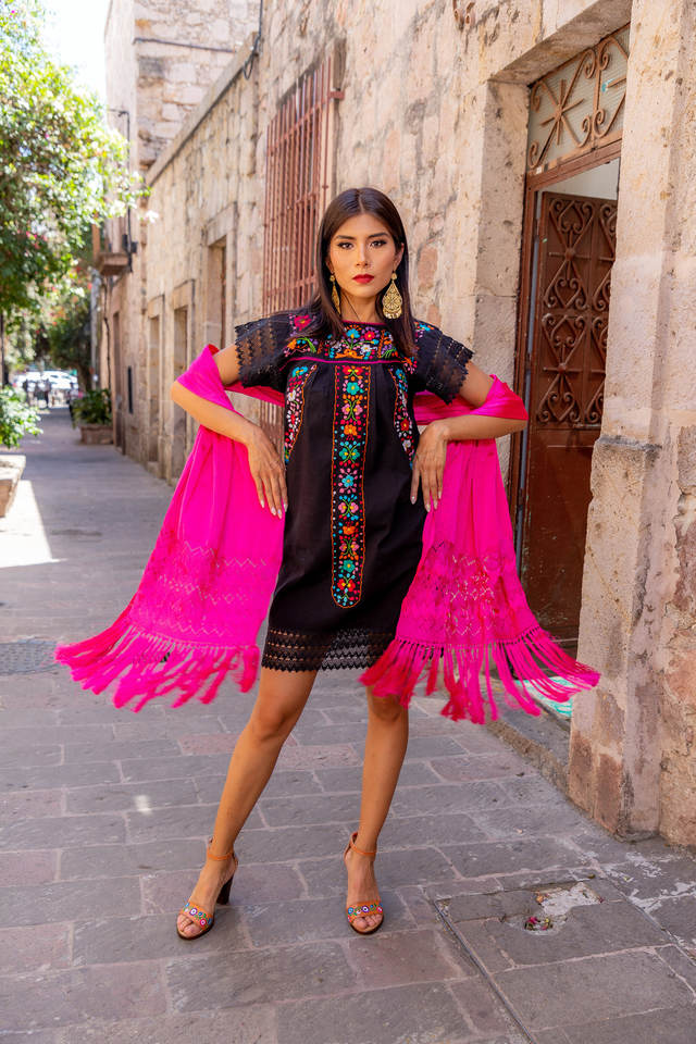 ชุดเดรสเม็กซิกันอินเทรนด์สำหรับผู้หญิงใส่ในฤดูร้อนชุดเดรสปักลูกไม้แขนสามส่วนแฟชั่นลำลองเอวธรรมชาติผ้าทอเป็นมิตรต่อสิ่งแวดล้อม