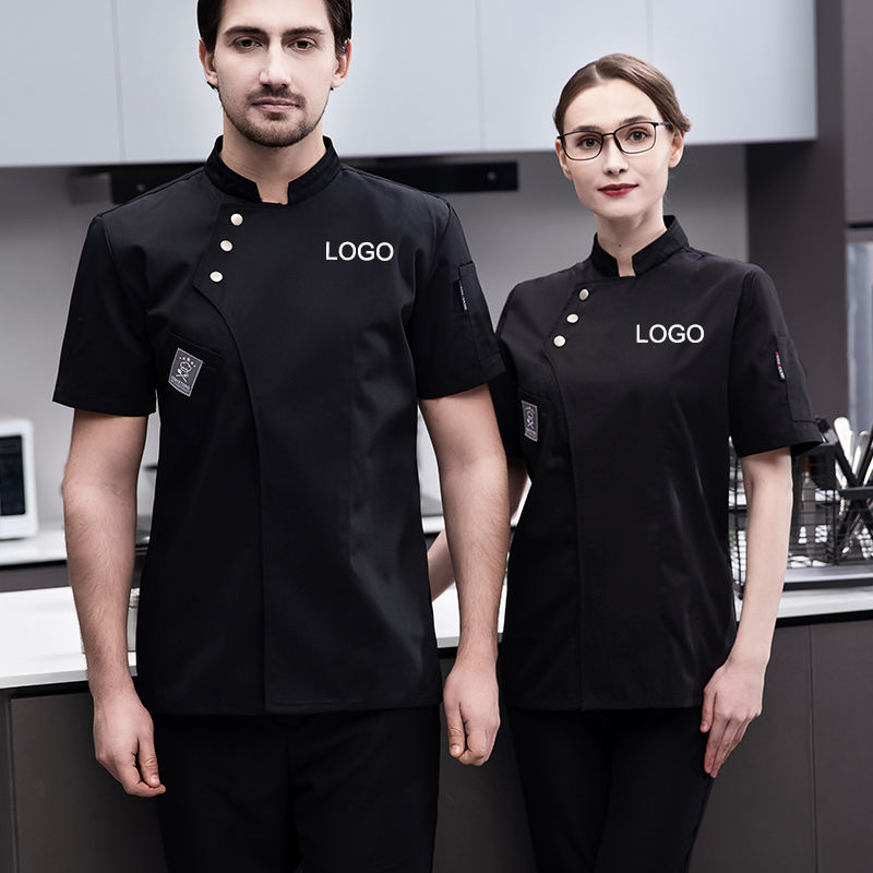 เสื้อเชิ้ตแขนสั้นทำงานฤดูร้อนสำหรับพนักงานร้านอาหารพนักงานโรงแรมบริกรสีดำแจ็กเก็ตผู้ชายผู้ชายมีกระเป๋าเครื่องแบบพนักงานเสิร์ฟ