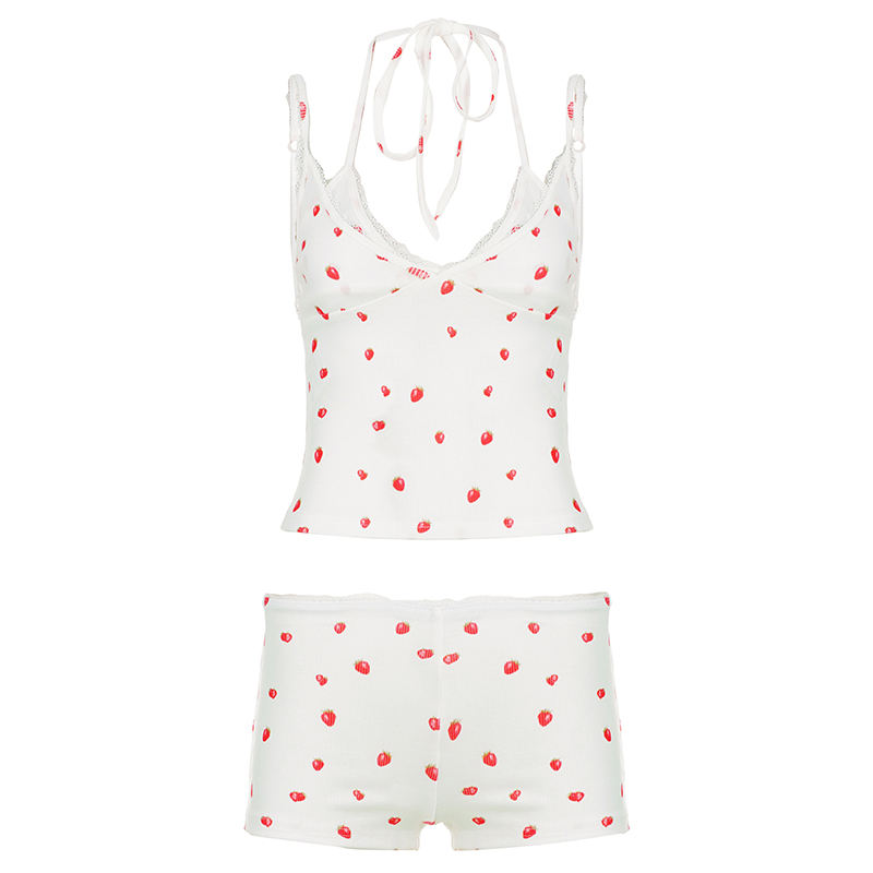 ชุดนอนลายสตรอว์เบอร์รี่สไตล์ Y2K ประดับลูกไม้ ชุดลำลองสำหรับผู้หญิง เสื้อสายเดี่ยวและกางเกงขาสั้น ขายส่ง