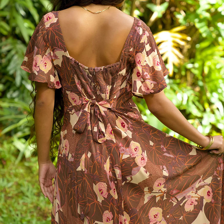 เดรสยาวทรงหลวมพิมพ์ลายโบฮีเมียนสำหรับฤดูร้อน คอวีลึก ผ้าลินินและวิสโคสสั่งตัดได้ แฟชั่นชุดเดรสผู้หญิง
