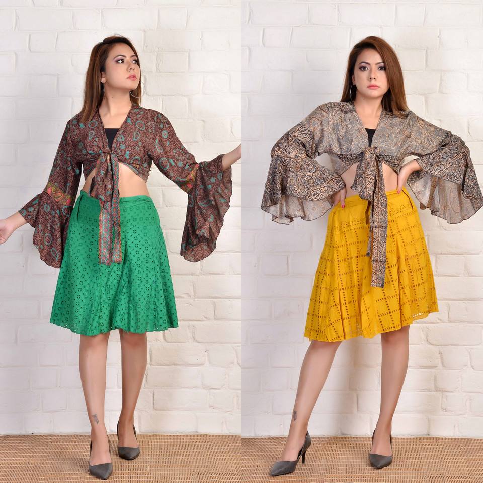 ชุดเซ็ตกระโปรงชีฟองโบฮีเมียนฤดูร้อนไซส์ใหญ่ พร้อมเสื้อครอปแขนกระดิ่งผูกโบว์ ลายดอกไม้ ระบายอากาศได้ดี