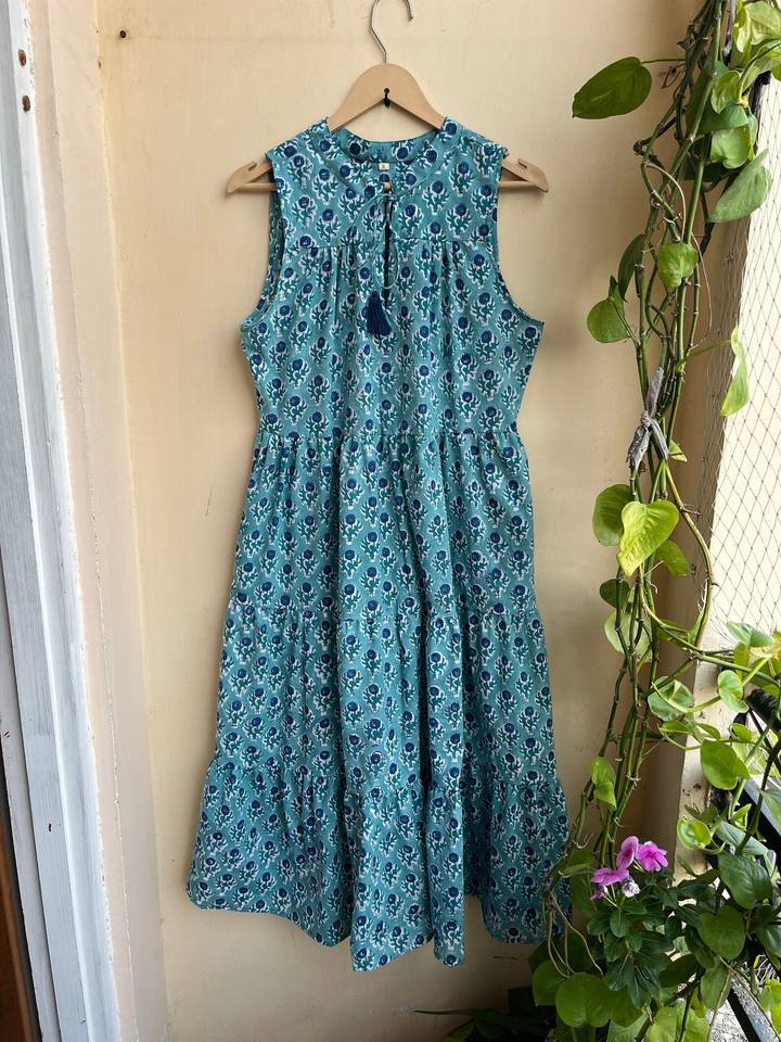 เดรสแม็กซี่ฤดูร้อนชุดเดรสชายหาดพิมพ์ลายบล็อกผ้าฝ้ายชุดเดรสแม็กซี่ลายดอกไม้แขนผ้าฝ้าย