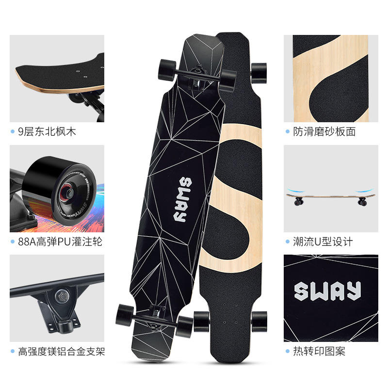 สเก็ตบอร์ดลองบอร์ดพินเทลขนาด 32 นิ้ว พร้อมพื้นกันลื่น สำหรับผู้ใหญ่ ดีไซน์ทันสมัย สีดำและลายไม้