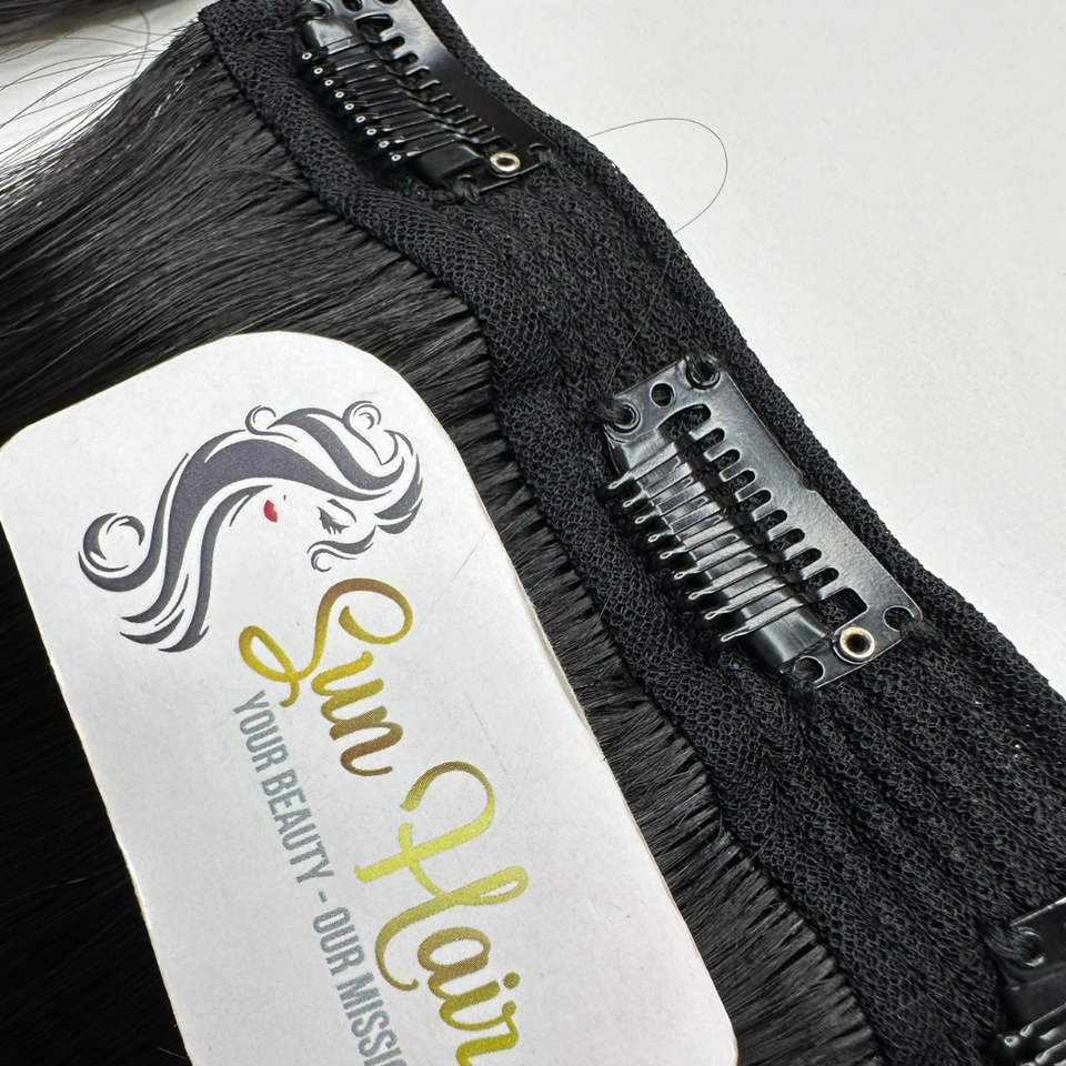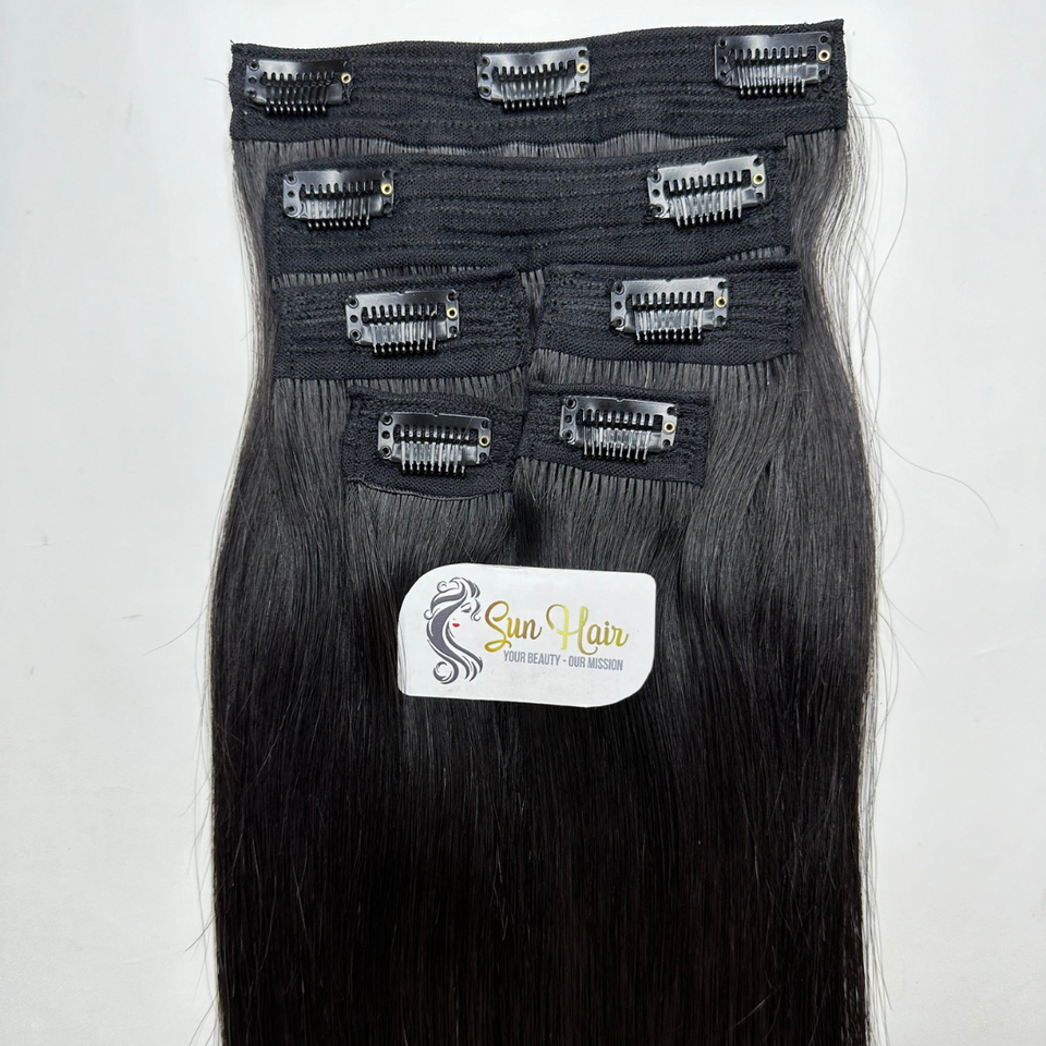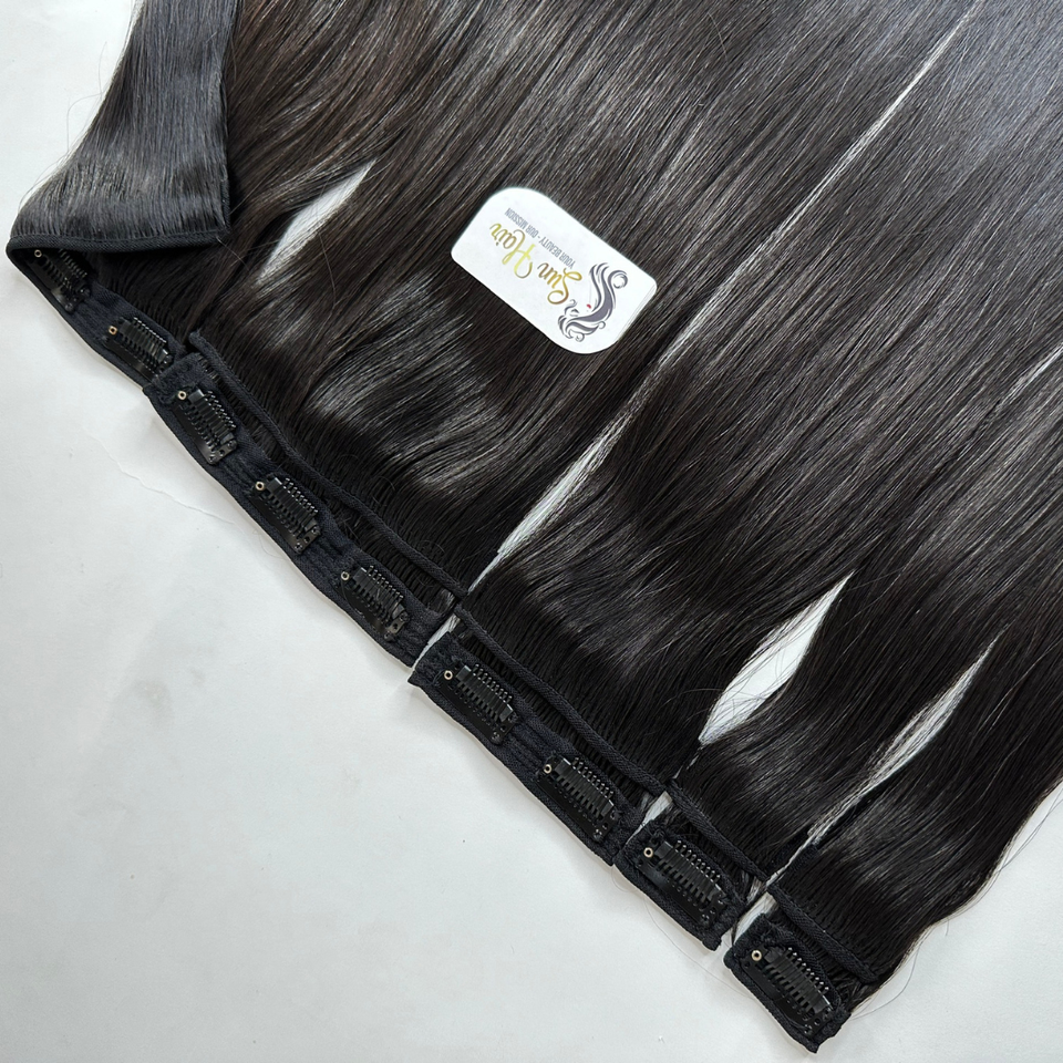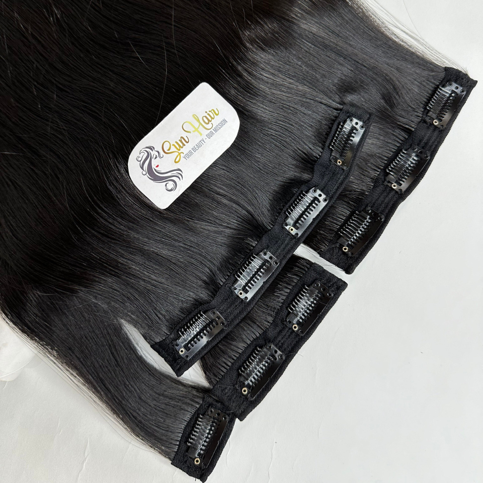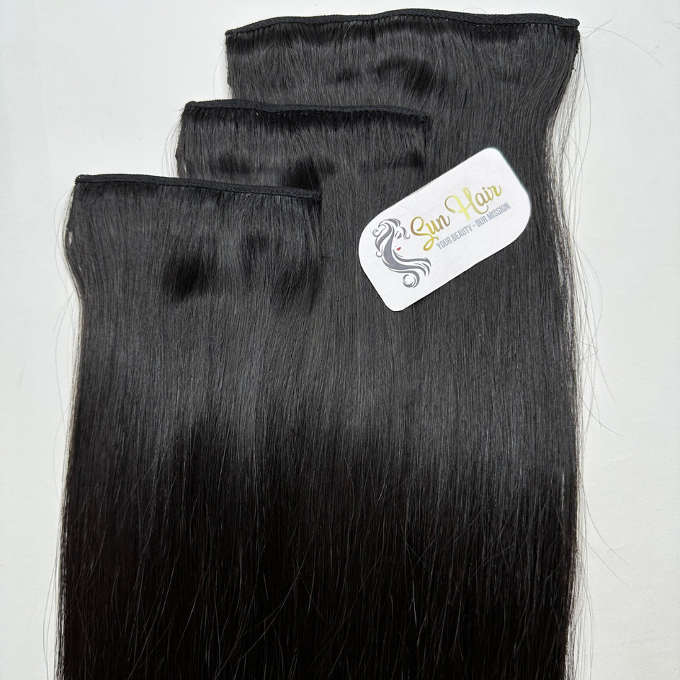 ผมต่อแท้เวียดนามสีดำตรงแบบเวอร์จิ้นคุณภาพสูงจากซัน คอมพานี แบบคลิปหนีบมองไม่เห็น ถักสองชั้นด้วยเครื่องจักร