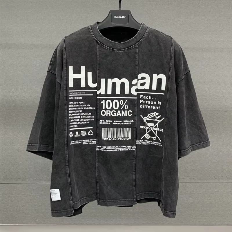 เสื้อยืดดีไซน์เนอร์ทรงบ็อกซี่ คอกลม ผ้าคอตตอนโอเวอร์ไซส์ ลายปะติดสีซีดแบบซันเฟด ไหล่ตก พิมพ์ลาย หนัก ซักย้อมสีแบบแอซิดวอช