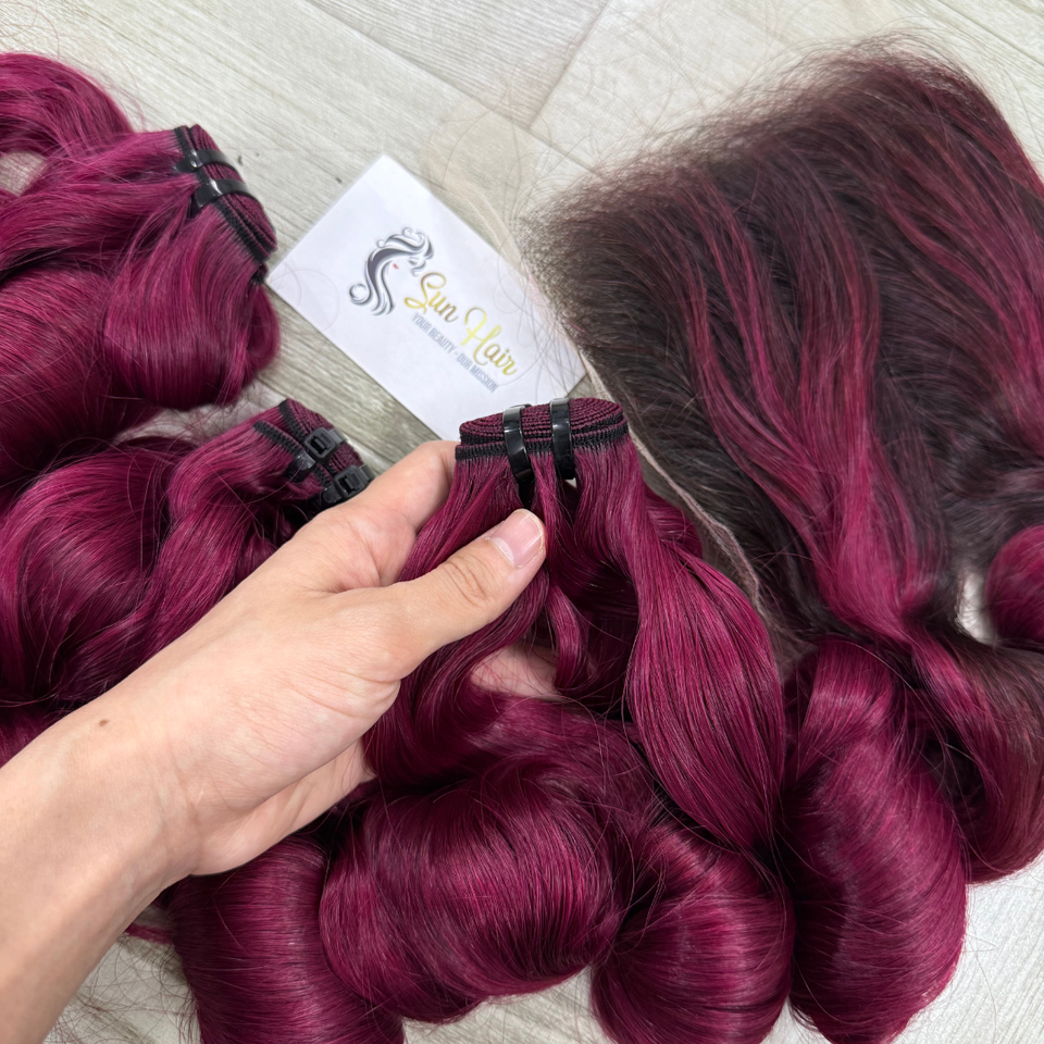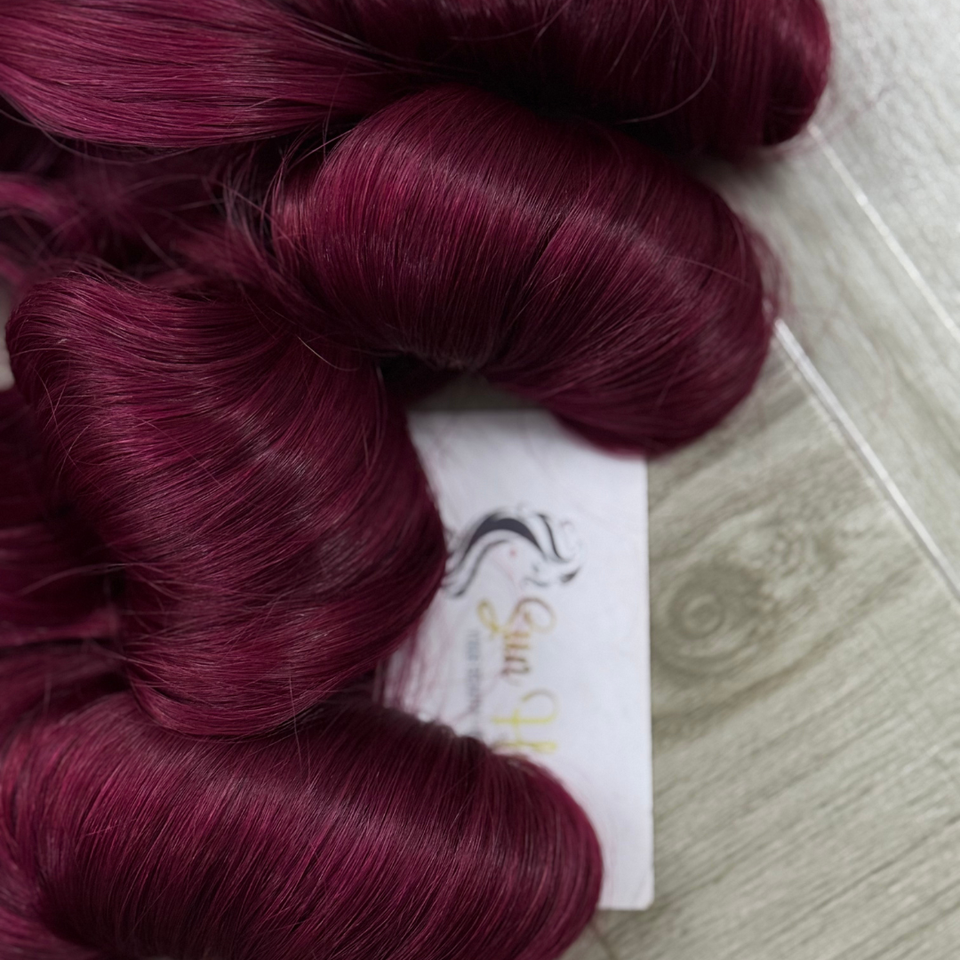 บริษัทซันแฮร์ ผลิตภัณฑ์ผมสีเบอร์กันดีแบบกำหนดเอง แบบผมลอนเด้งดึ๋ง แบบผมต่อแบบเวฟ จัดเรียงเกล็ดผม ผมเวอร์จินแท้จากเวียดนาม ต่อผมแท้