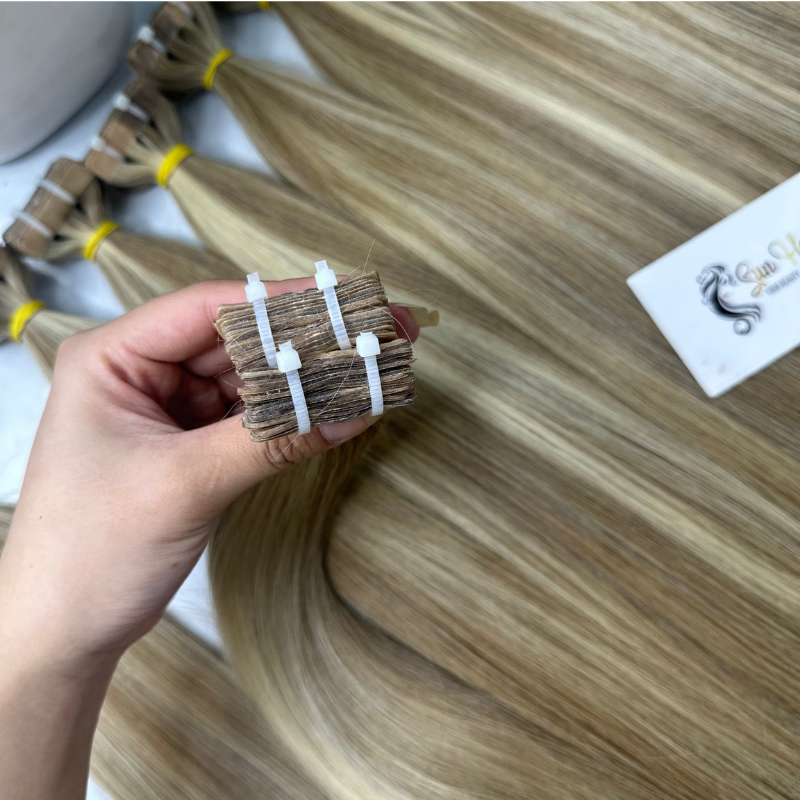 บริษัทซันแฮร์ แฮร์พีซแบบเทปติดผม ไฮไลท์สีผสม จัดเรียงเกล็ดผม แบบดับเบิ้ลดรอน ผมแท้เวียดนาม ต่อผมแบบเทป คาเบลโล ฮูมาโน
