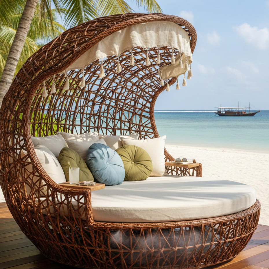 เตียงอาบแดดหวายสานมือ สไตล์ร่วมสมัย พกพาสะดวก สำหรับใช้ริมชายหาด สระว่ายน้ำ สวน โรงแรม และวิลล่า