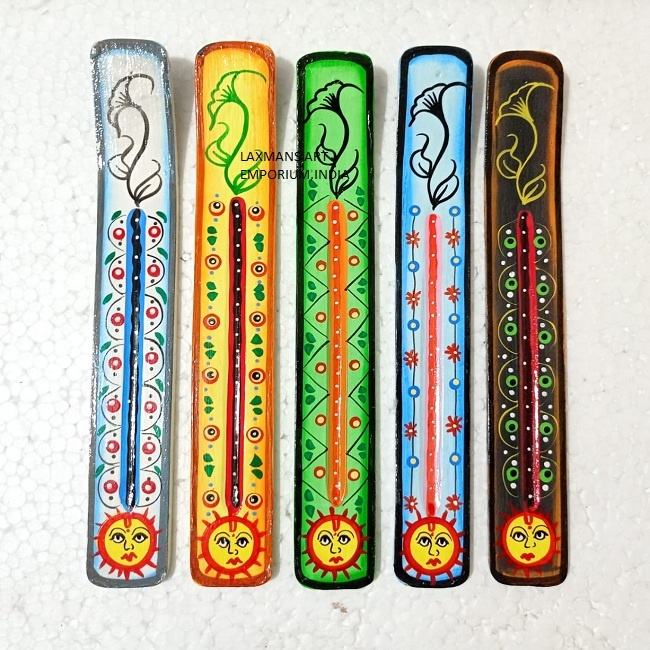 เตาเผาธูปหอมทำจากไม้มะม่วงทาสีด้วยมือดีไซน์ใหม่ดวงอาทิตย์ยาว22ซม. แบบอินเดีย