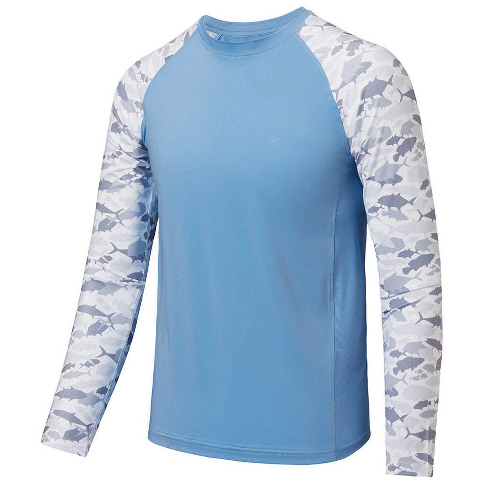 เสื้อตกปลาแขนยาวสำหรับผู้ชายเสื้อตกปลาพิมพ์ลายซับลิเมชันผ้าโพลีเอสเตอร์กลางแจ้งป้องกันแสงแดด
