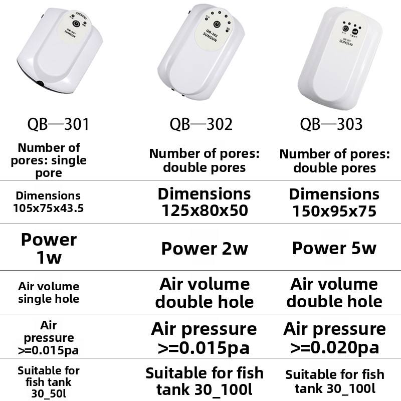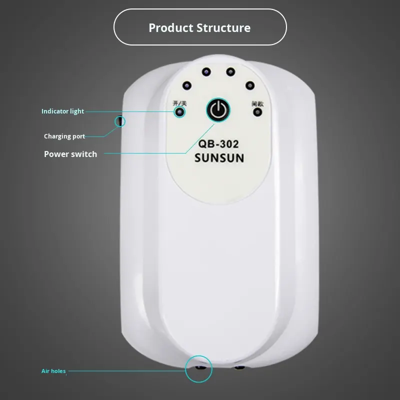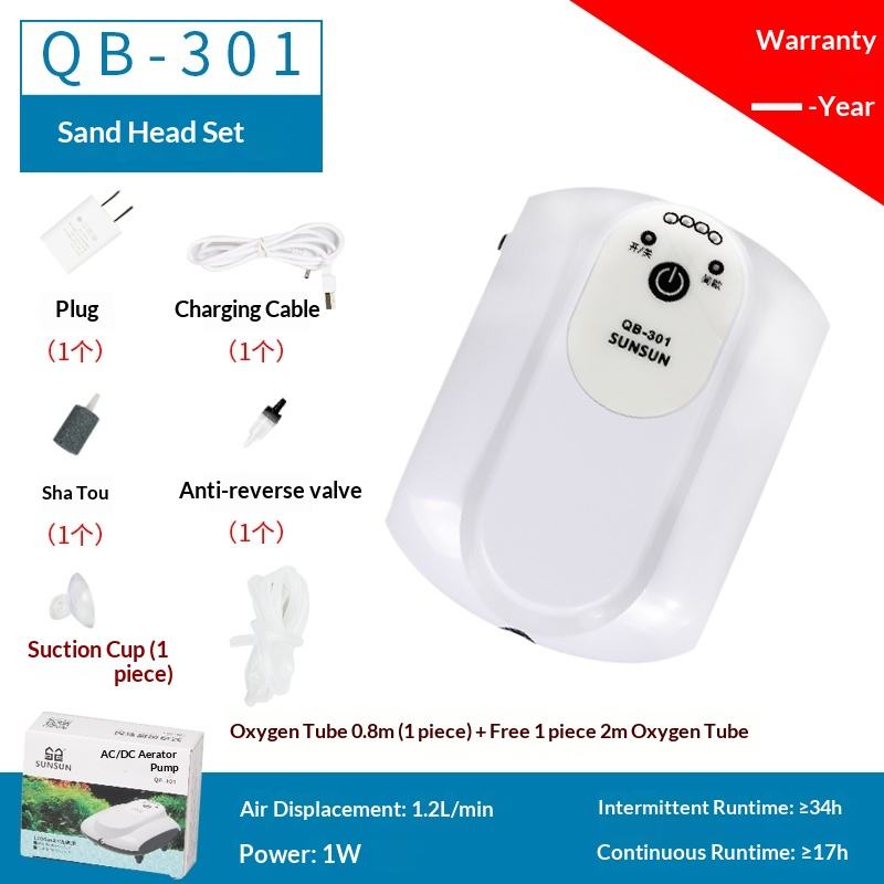 ปั๊มออกซิเจนสำหรับตู้ปลา SunSun รุ่น QB-301/QB-303 แบบพกพา ใช้ไฟบ้านได้ ชาร์จผ่าน USB ได้ เงียบพิเศษ