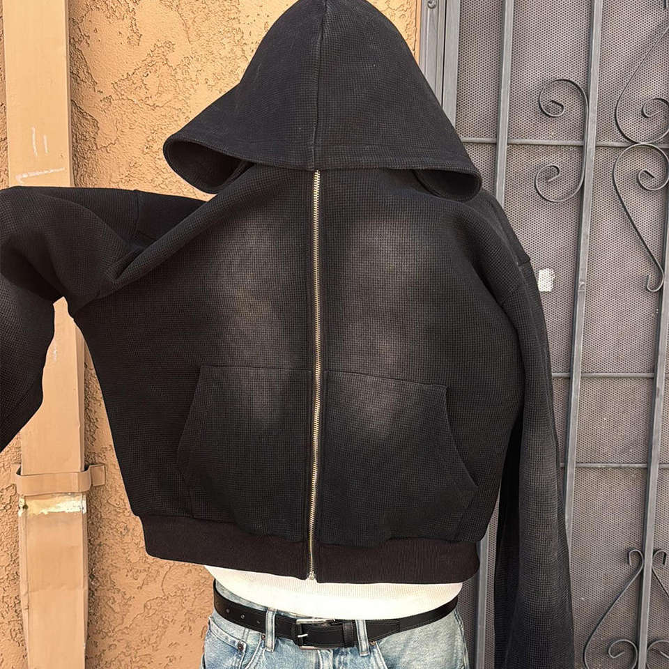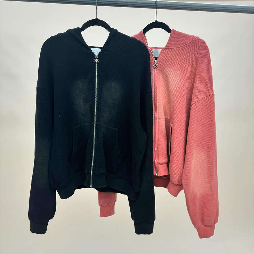 เสื้อฮู้ดซิปผ้าฟลีซหนานุ่มทรงโอเวอร์ไซส์สำหรับผู้ชาย ผลิตโดยโรงงานซันเฟด ดีไซน์วินเทจแบบย้อมสีเอซิด บล็อกสีต่างๆ รับผลิตตามแบบ