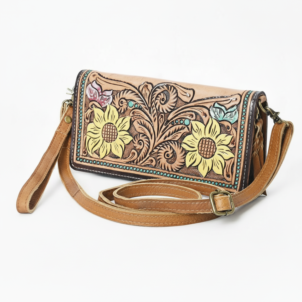 กระเป๋าสลิงหนังแท้สำหรับผู้หญิงสลักลายดอกทานตะวันและดอกไม้หรูหราฤดูใบไม้ร่วง