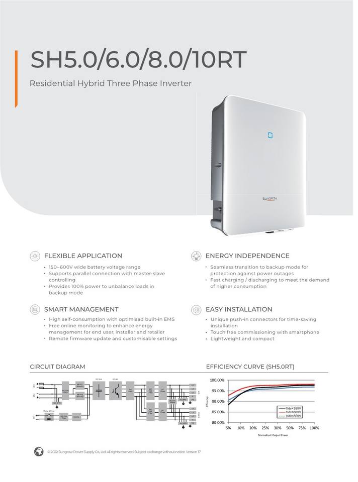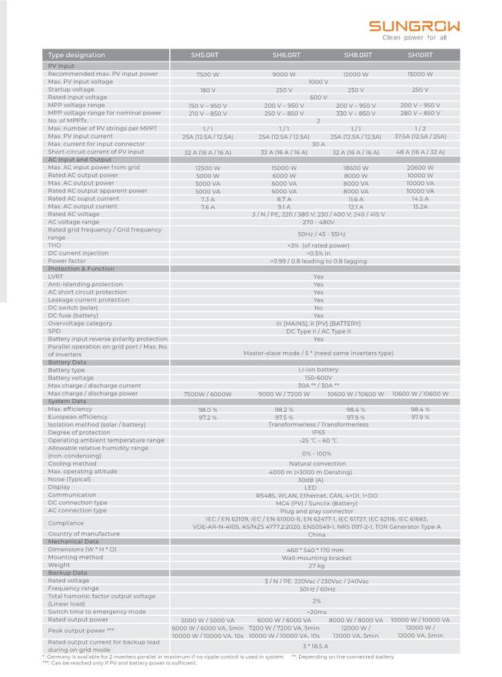 Sungrow Sh8.0rt เวอร์ชั่นยุโรปสต็อก EU sungrow 8kw ไฮบริด 3 เฟส 8kva ออนปิดอินเวอร์เตอร์