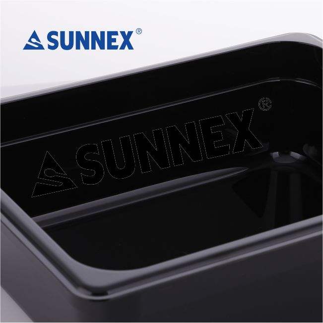 ถาดอาหารทรงสี่เหลี่ยมผืนผ้า Sunnex ขนาด 1/2 นิ้ว สีดำ ทำจากโพลีคาร์บอเนตและสแตนเลส ความลึก 4 นิ้ว สามารถวางซ้อนกันได้