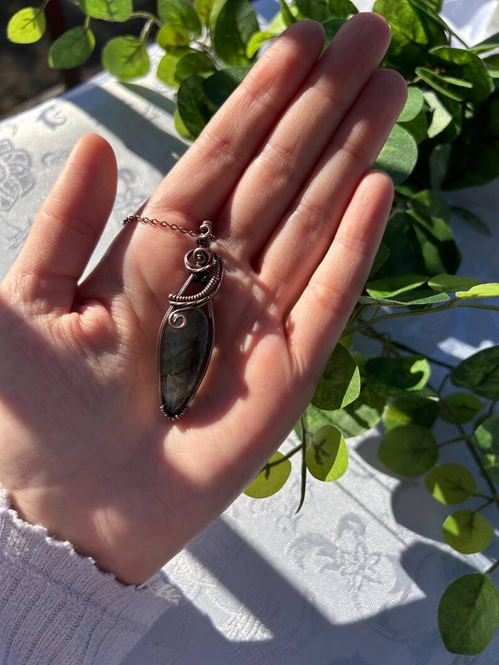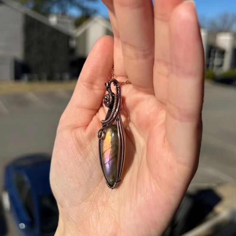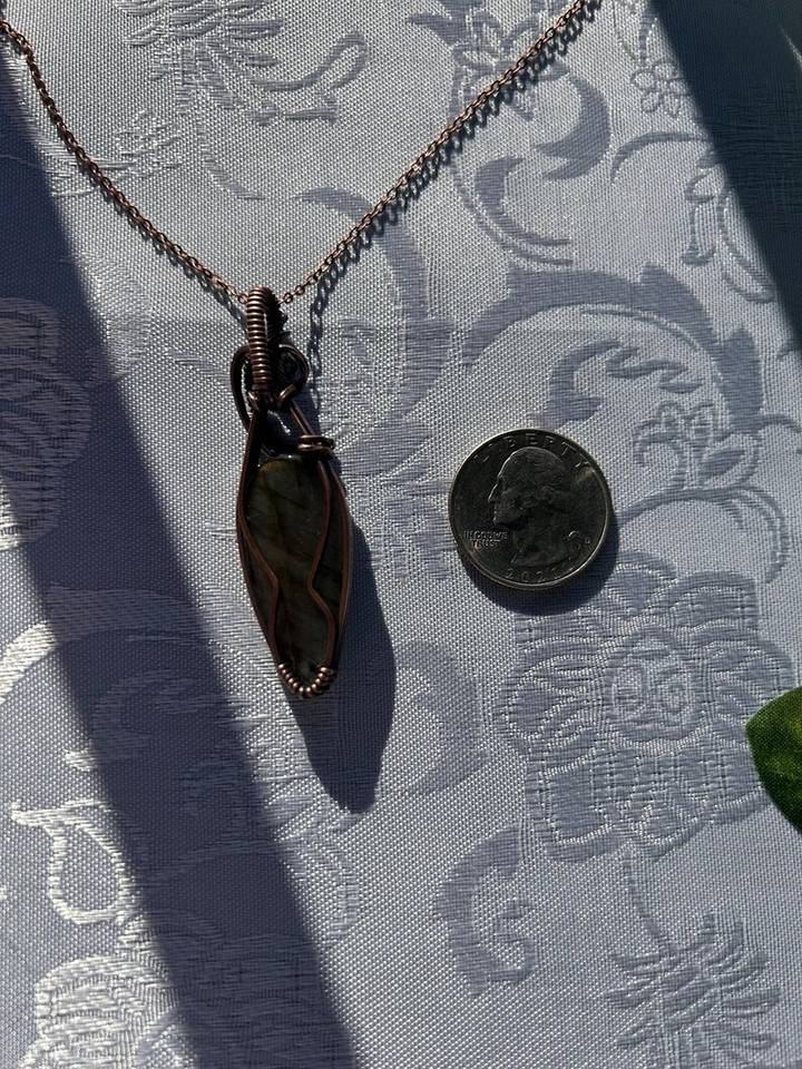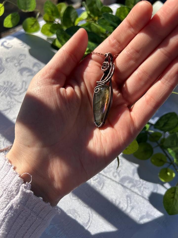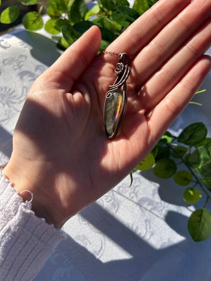 จี้ลาบราดอไรต์วินเทจสีพระอาทิตย์ตก ชุบทองบนเงินแท้ ประดับด้วยลวดเงิน งานฝีมือทำมือ สร้อยคอสไตล์โบฮีเมียน ของขวัญสำหรับเธอในโอกาสหมั้น