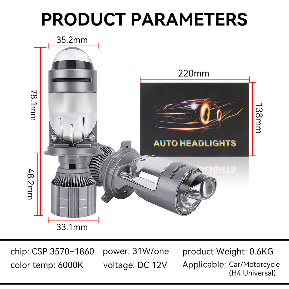 หลอดไฟหน้าโปรเจคเตอร์ LED รุ่น Super Bright 100W H4 A82 อลูมิเนียมเลนส์มินิ แสงคู่ 6000K IP67 กันน้ำ ใช้ได้กับรถยนต์และรถบรรทุกทั่วไป