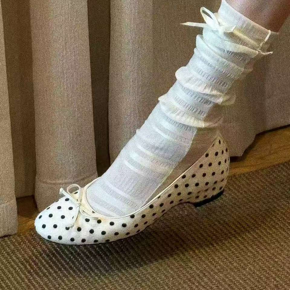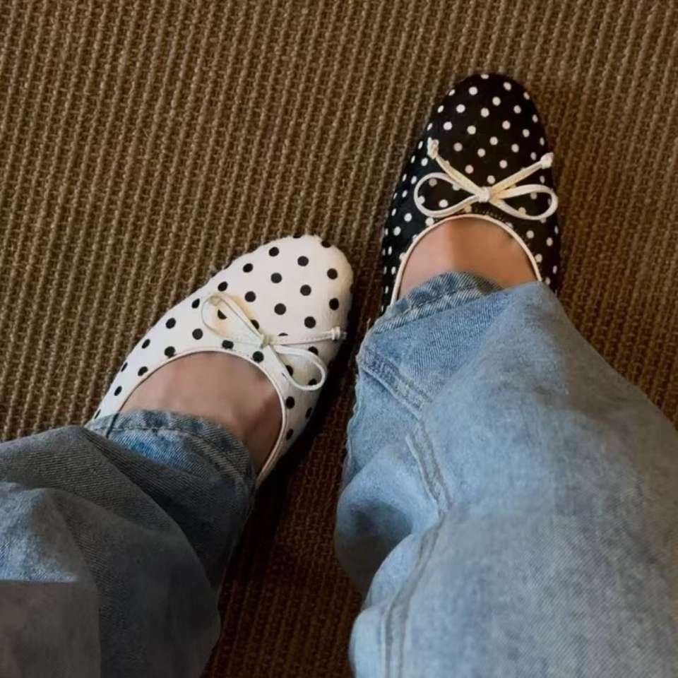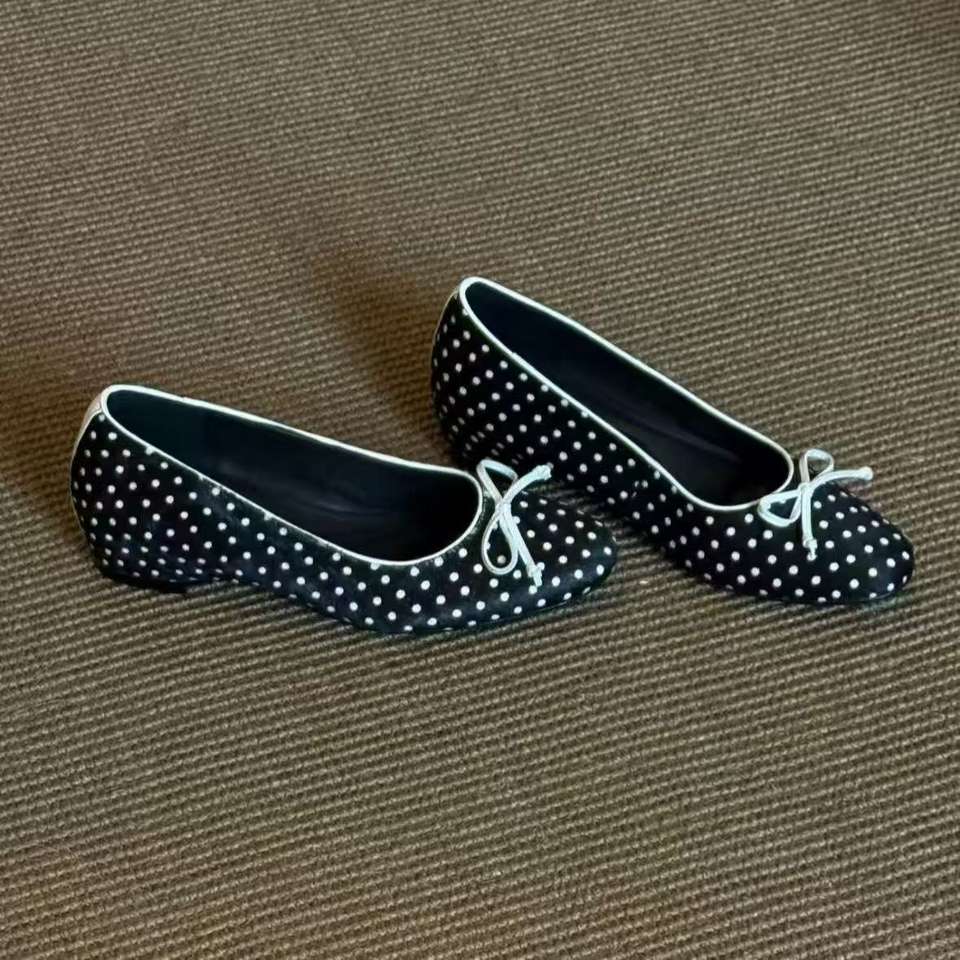 รองเท้าส้นเตี้ยแบบสวม ดีไซน์หัวมนน่ารัก ประดับโบว์หวาน ลายจุดขาวดำ ระบายอากาศได้ดี สไตล์บัลเล่ต์คลาสสิคย้อนยุค