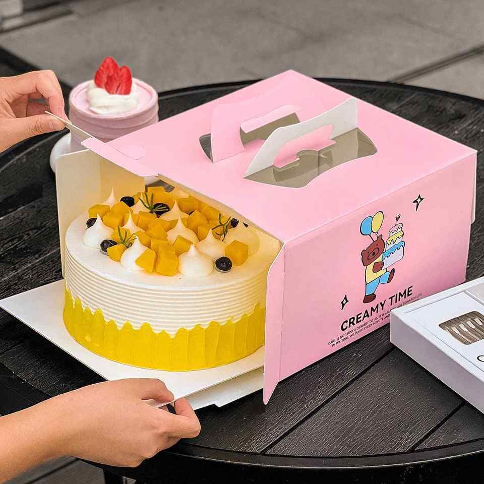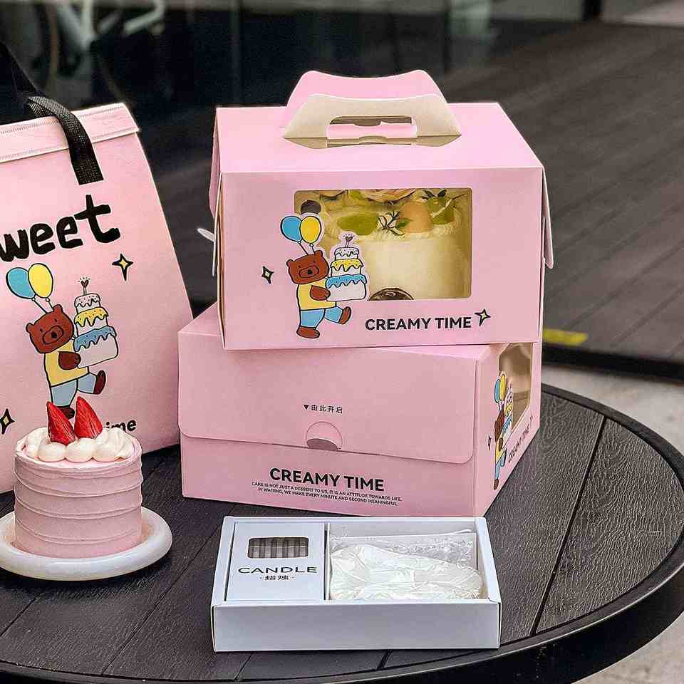 กล่องบรรจุภัณฑ์เค้กกระดาษแข็งเกรดอาหารแบบกำหนดเอง Super ETpack พร้อมหน้าต่างใสและหูหิ้วสำหรับขนมหวานและขนมอบ