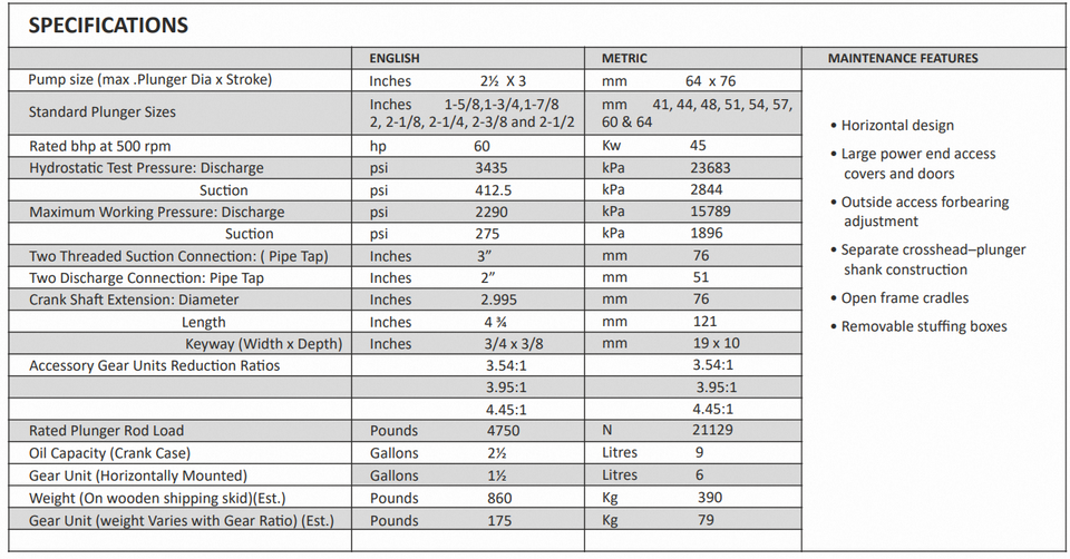 Displacement:3280 bpd (95.67 gpm) at 970 psig 1386 bpd (40.43 gpm) At 2290 psig