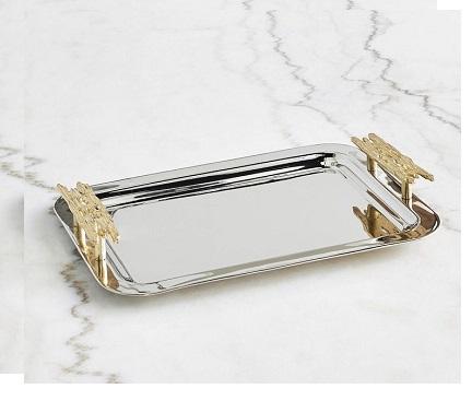 ถาดเคลือบอลูมิเนียมพร้อมที่จับลายดอกไม้ทองเหลืองทนทานสำหรับอุปกรณ์โรงแรมสำหรับเสิร์ฟเค้กและขนมอบ